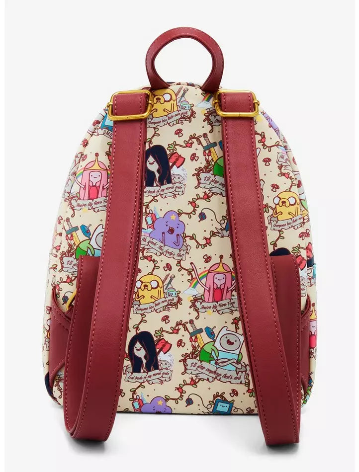 Adventure around Ooo with this mini backpack on! It features artwork of your favorite Adventure Time characters with quotes on banners and other fun icons. Comes with front zipper pocket and interior drop pocket.