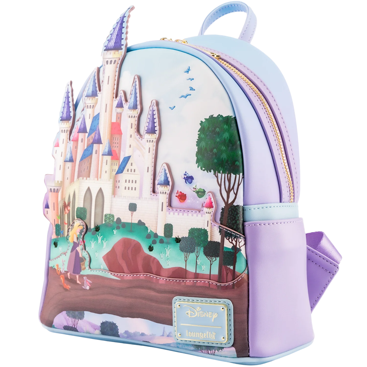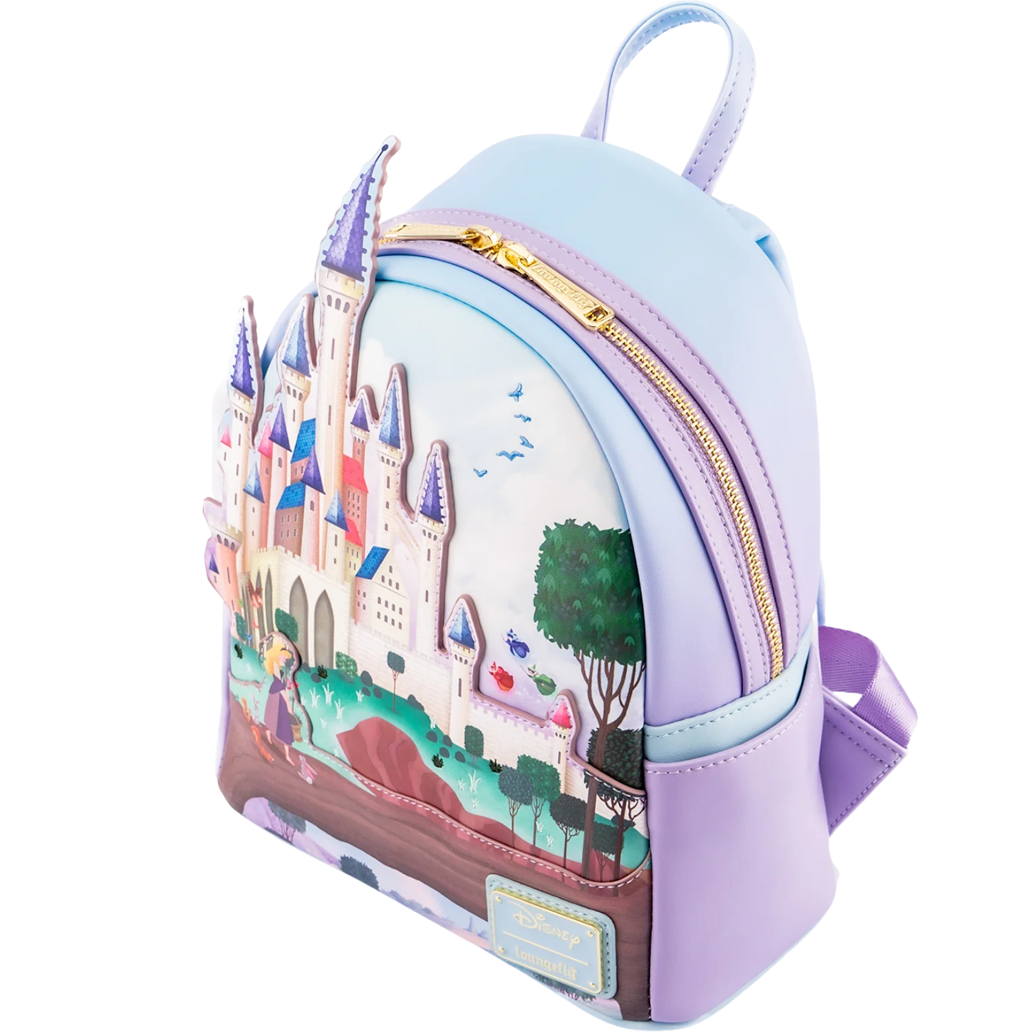 Add onto your Loungefly castle series collection with this Loungefly Disney Princess Sleeping Beauty Castle Series Mini Backpack. Featuring classic scenes on the front and back with applique, embroidered, and printed details on a faux leather base.