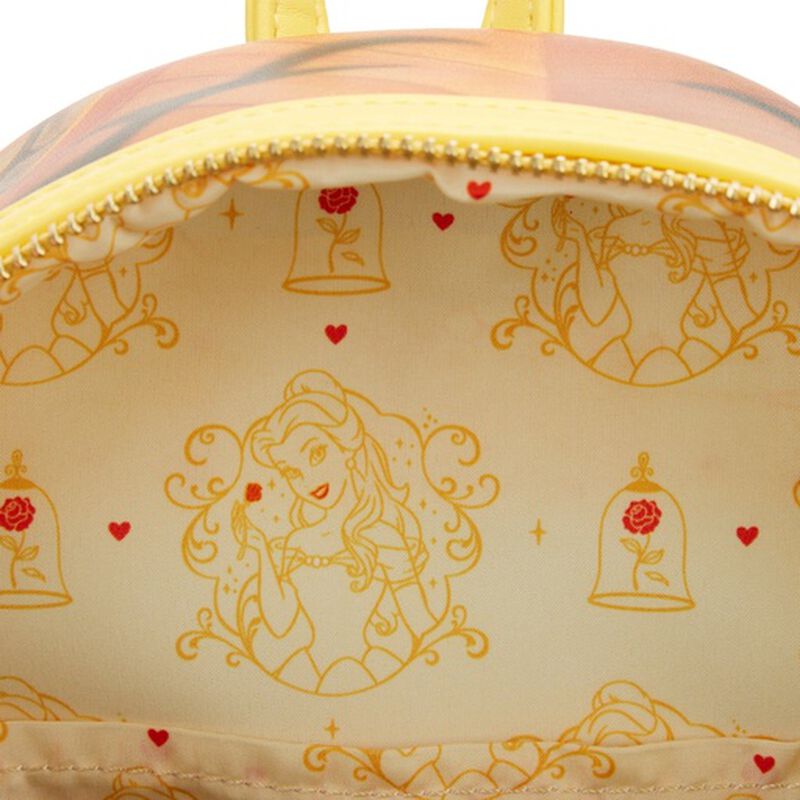 An enchanting journey awaits you with this Loungefly Disney Beauty and the Beast Belle Princess Scenes Mini Backpack. Your invitation has arrived, and you have front-row seats to witness Belle’s story as it plays out on this backpack. Through stunning, original in-house art, scenes from Beauty and the Beast unfold on all sides! On the front zipped compartment, Belle enters the town, book in hand, while curious bystanders look on. Above this scene, Belle and the Beast dance in the ballroom. The side pockets include precious interactions between Chip and Mrs. Potts and Lumiere and Cogsworth. On the back, Gaston admires his reflection in the mirror. An enamel zipper charm of Mrs. Potts pulls the scenes together. It’s the perfect accessory for complementing a Disney outfit or turning everyday travels into enchanting adventures.