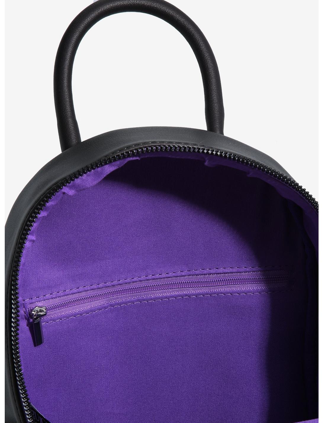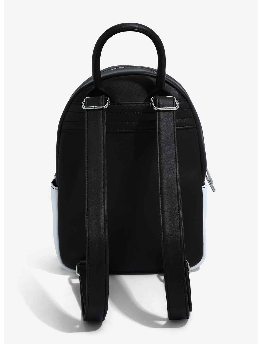 It's showtime! Bring all of your essentials to the Neitherworld in this stylish Beetlejuice mini backpack! Featuring chibi Beetlejuice hitching a ride from the Maitland's house on a sandworm, and chibi Lydia taking pictures of ghosts on the front zipper pocket. Comes with adjustable straps, interior zipper pocket and black and white striped side pockets. Complete with top carrying handle and a skull zipper pull.