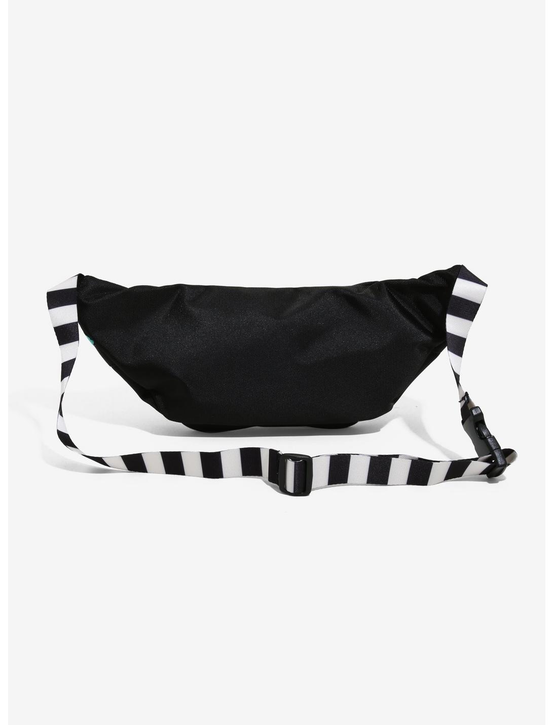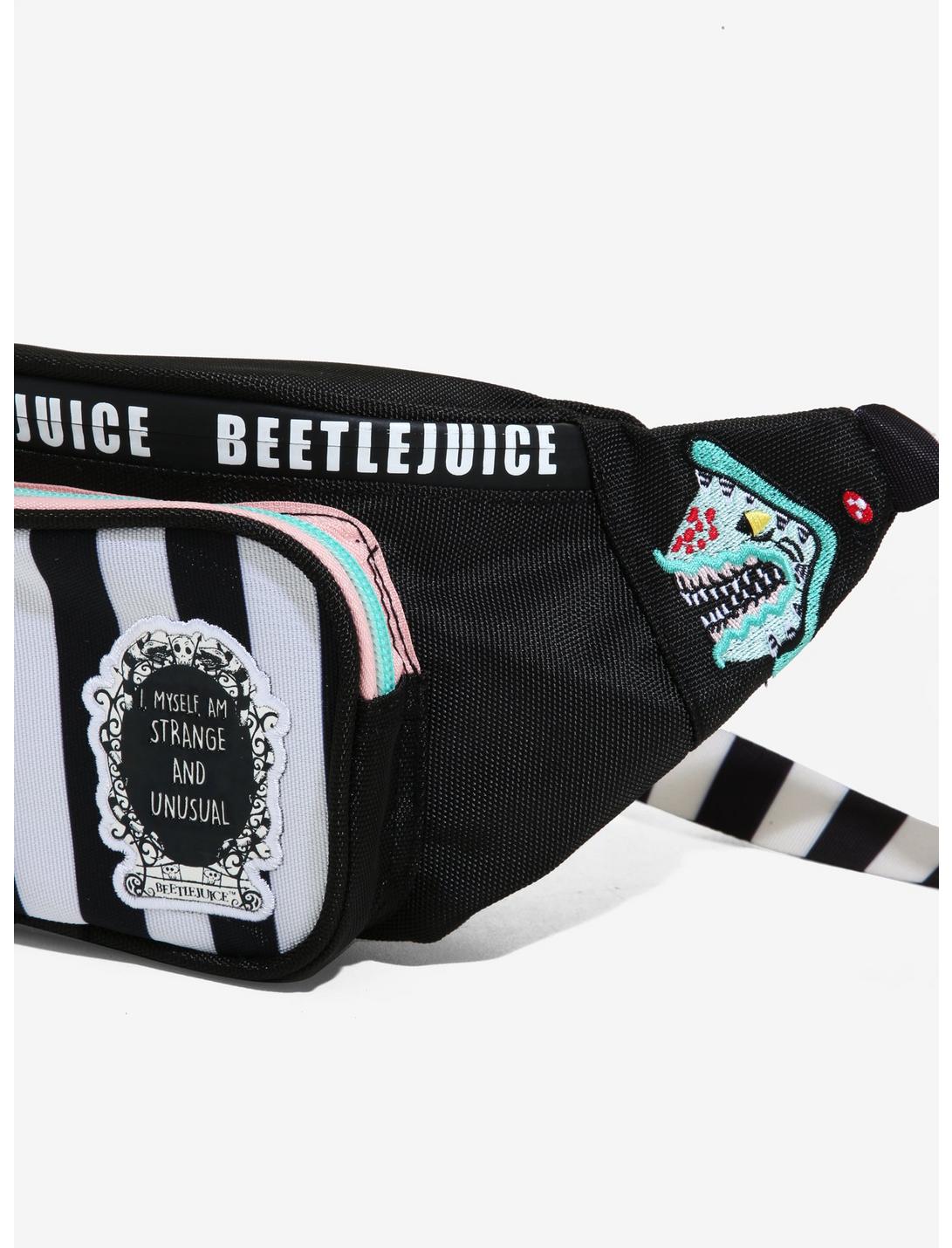 Get your style inspo from Saturn! This fanny pack looks just like the black and white sandworms from Beetlejuice. Features front and main zip pockets, two embroidered sandworm heads, and an adjustable striped buckle strap. A faux leather patch that reads, "I, myself, am strange and unusual" is the cherry on top.