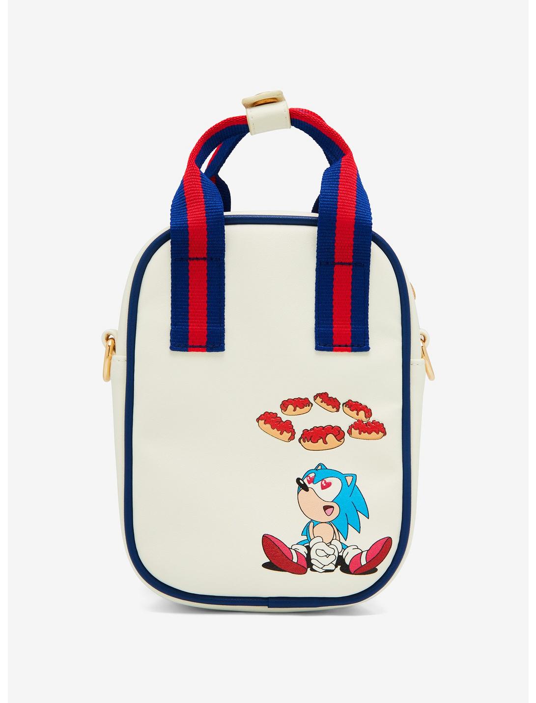 Carry your essentials in video-game fashion with this Sonic the Hedgehog-inspired crossbody bag! With a debossed design of Sonic with a chili dog cart and a striped ruffle applique on the front pocket, the back features a portrait of Sonic daydreaming about his favorite meal. With two zippered front pockets, and a removable crossbody strap, this bag is perfect for fans of the blue speedster.