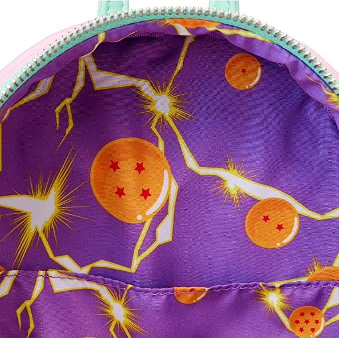 Show off your genius! Loungefly has recreated Bulma’s iconic pink dress from Dragon Ball in this cosplay mini backpack, bringing to life every detail. The base of the bag is Bulma’s pink dress with her name emblazoned on the front, wrapped with her brown belt and complete with a 3D pouch side-pocket. Her hair bow is perfectly replicated in 3D at the top of the bag. Throughout the bag you’ll notice custom accents in the same color as Bulma’s beloved mint-green hair—such as the adjustable straps! Bag features shiny metal hardware, and the zipper on the front pocket is adorned with an enamel-filled pull in the shape of Dragon Radar with 3 Dragon Balls ready to be discovered! To finish it off, the bag is lined with unique Dragon Ball themed lining.