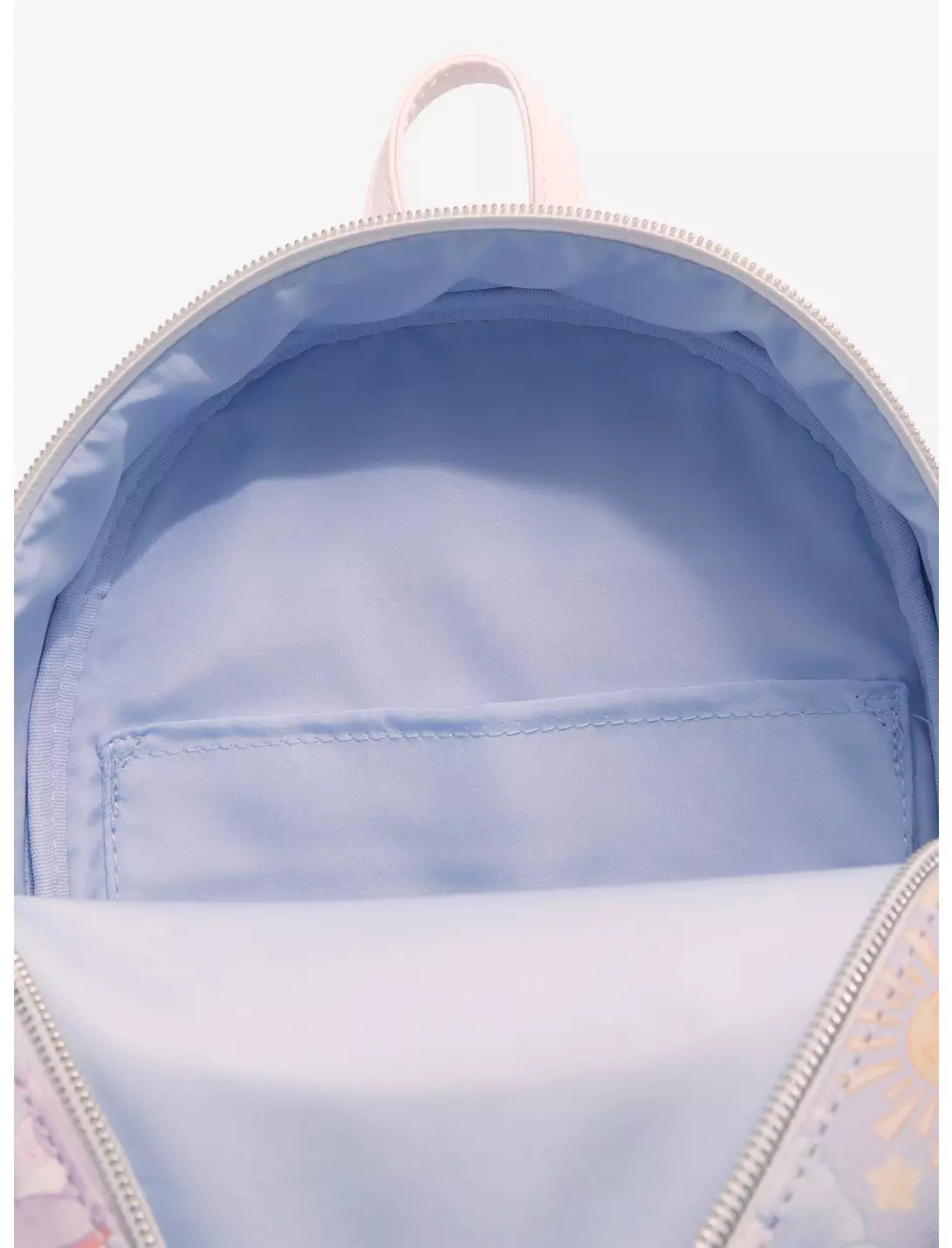 This Care Bears mini backpack has the softest, cutest pastel colorway! It's printed with Sweet Dreams Bear, Tenderheart Bear and Cheer Bear holding balloons in the sky amongst clouds, rainbows, suns and hearts. There's a front pocket, interior pocket and adjustable straps.