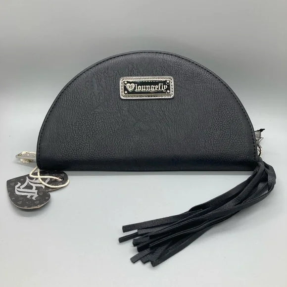 This is your time to shine and release your inner astrologer with this gorgeous Celestial design Loungefly wristlet. Featuring a crescent moon shape with embroidered and debossed detailing, it's the perfect accessory for someone who has their head in the stars! Measuring approximately 6” width by 4” height.