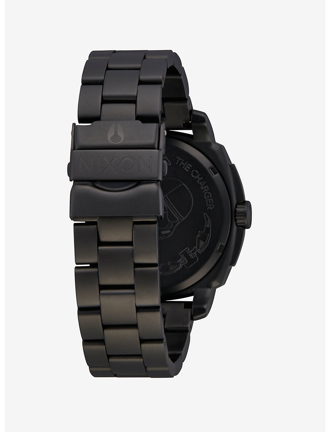 The First Order can only operate effectively with the absolute loyalty of its followers. Should any soldier be found guilty of treason, it is up to this special branch of Stormtrooper to dispense final justice. Custom engraved caseback with Executioner Trooper helmet, and the phrase, "Electric...Shock." First Order symbol at six o'clock marker. With clean contours and substantial design, the Charger takes a bold step into the Nixon collection. The unique cushion shaped case has just the right size and presence to handle the gauge-inspired dial and blends smoothly into the stainless steel band. Miyota Japanese quartz 3 hand movement with date function and custom seconds hand. 21-19 mm tapered custom solid stainless steel free-swing 3 link bracelet band and solid stainless steel double locking clasp with micro adjust. Japanese quartz 3-hand movement with date function.