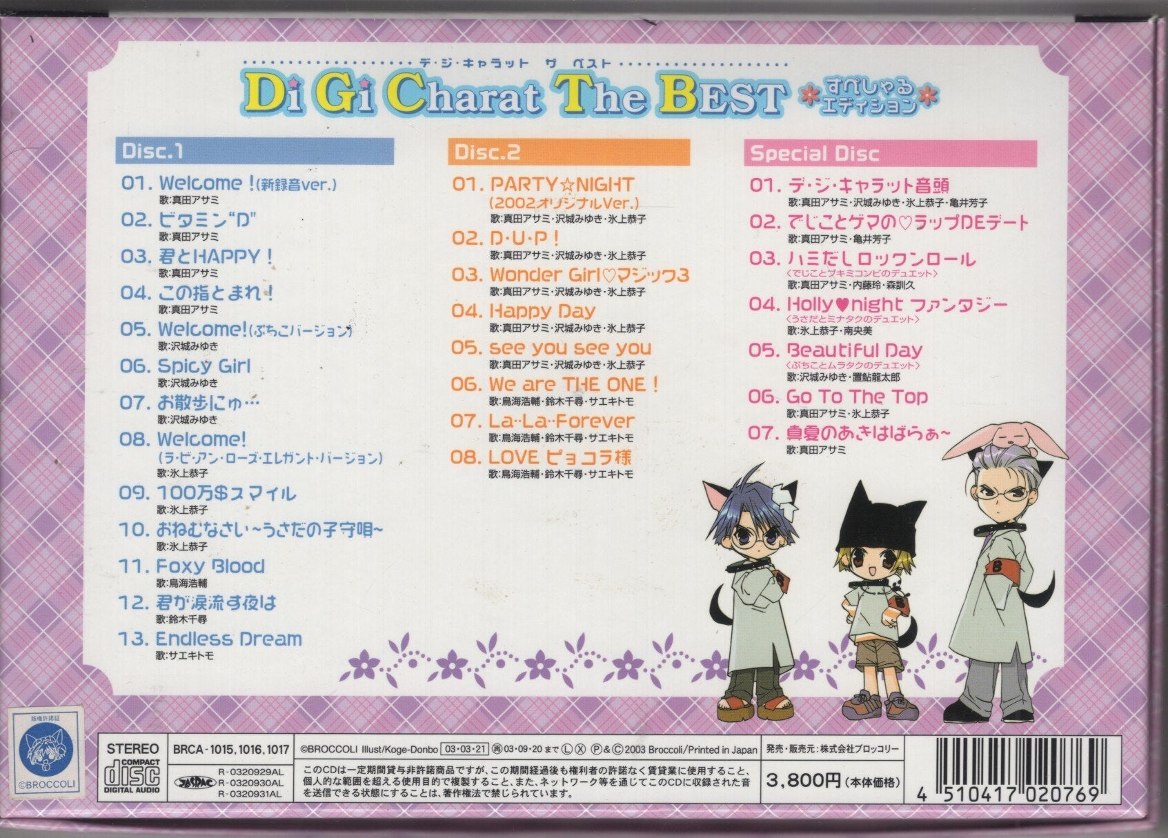 Listen to some of THE BEST Music from the anime series " Di Gi Charat". This Special Edition comes with three CD's so you can have your favorites on at all times.