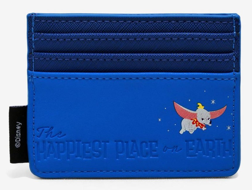 It's been 65 years since Walt Disney welcomed the very first guests to Disneyland. Commemorate the magical milestone with a dazzling new cardholder from Loungefly! This faux leather design features an embroidered castle and fireworks with bead details, an adorable Dumbo graphic, debossed "The Happiest Place on Earth" lettering, red interior lining with an allover character pattern, and 4 card slots.
