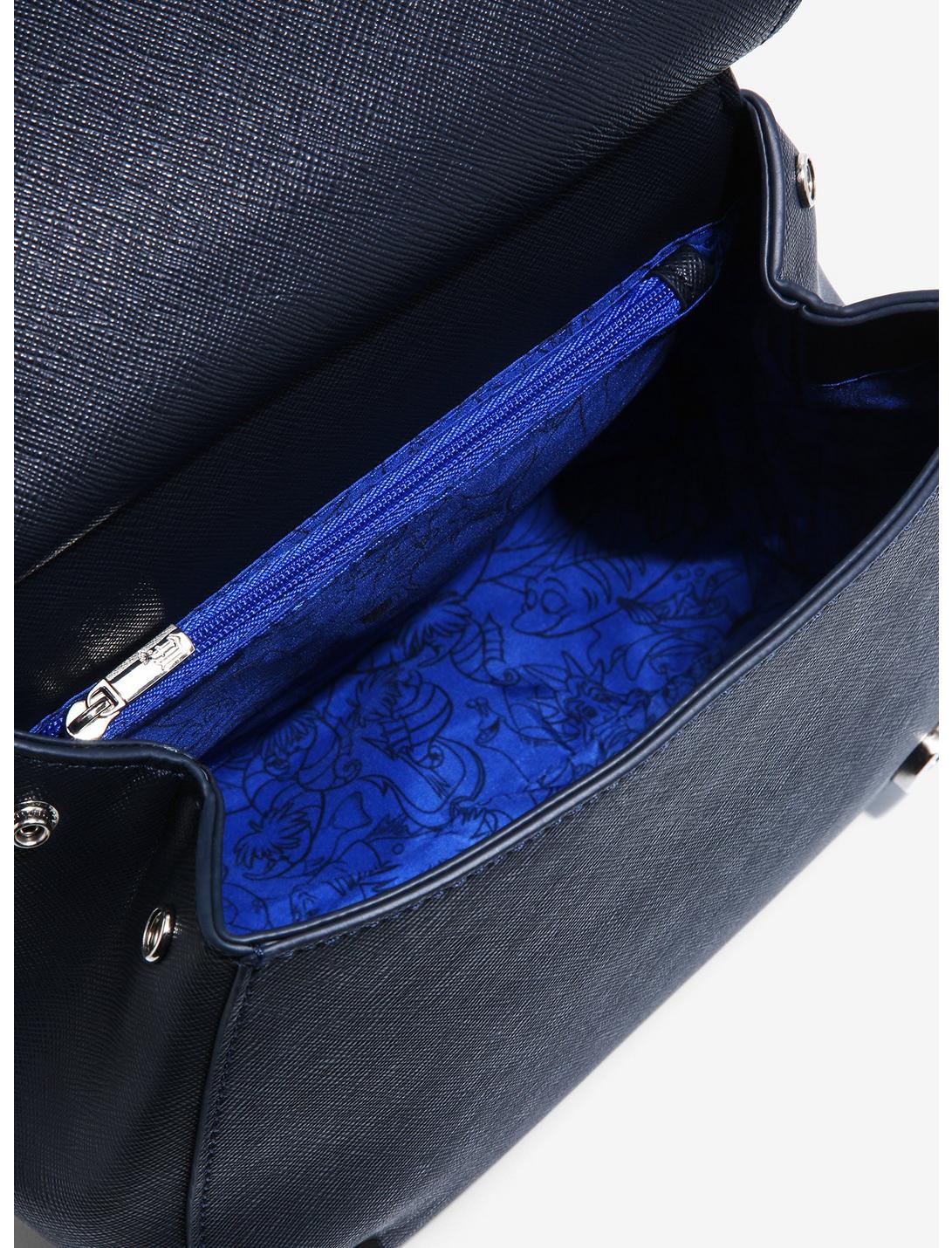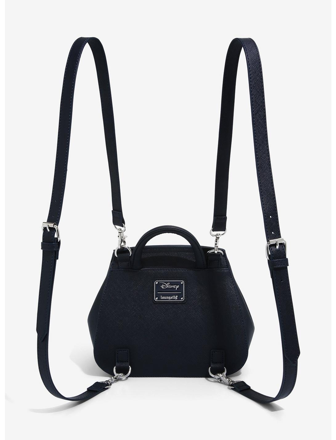 Take Ariel on a tour to explore that shore up above! The Disney Princess can be part of your world when you add this faux leather Loungefly mini backpack to your outfit. A dreamy graphic of Ariel sitting in front of the moon is printed on the exterior, surrounded by her friends from under the sea. This accessory also features an enamel brand badge, silver-tone hardware, blue interior lining with an allover character print from Disney's The Little Mermaid, an interior zippered pocket, and adjustable straps that can be removed or used to convert it into a crossbody bag.