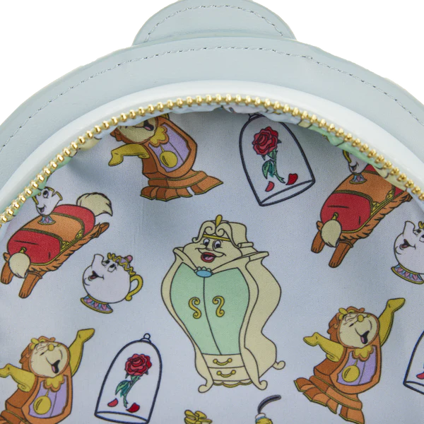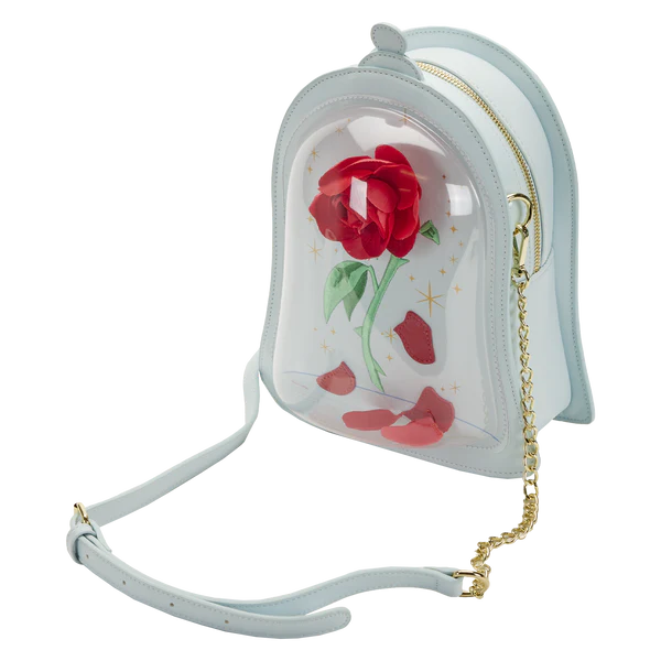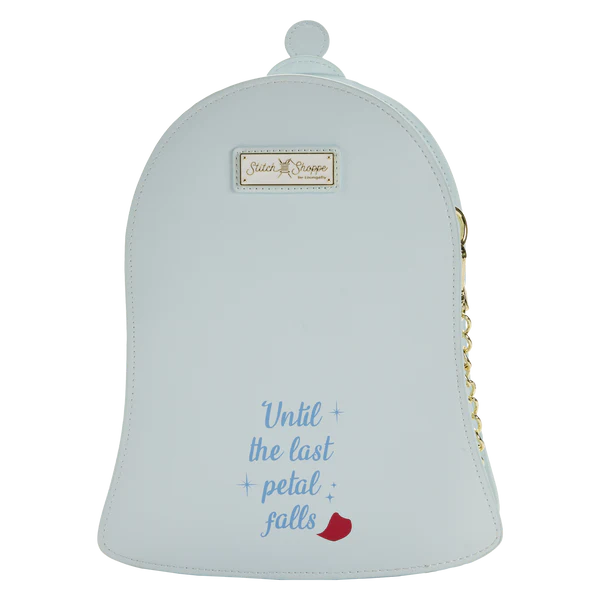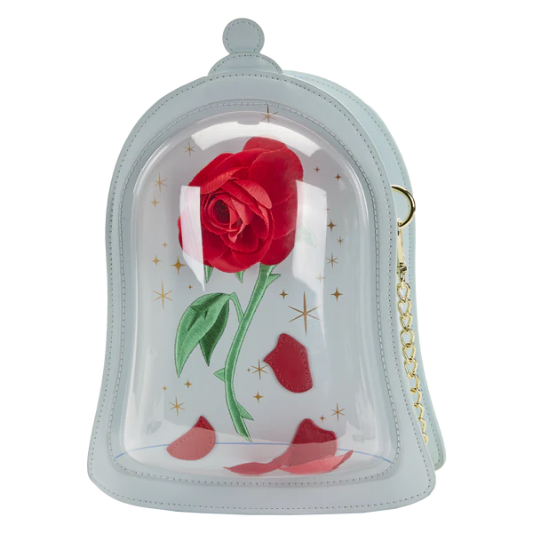 Bring the magic of your favorite fairytale to life with the Stitch Shoppe by Loungefly Beauty and the Beast Glass Case Rose Crossbody Bag. This spellbound accessory takes the form of the Beast’s bell jar. On the front of the bag, a three-dimensional rose is enclosed in a domed, transparent capsule. Gold sparkles appear near the enchanted rose’s flower while fallen petals rest near its embroidered stem. On the back, a single petal appears next to the phrase, “Until the last petal falls.”