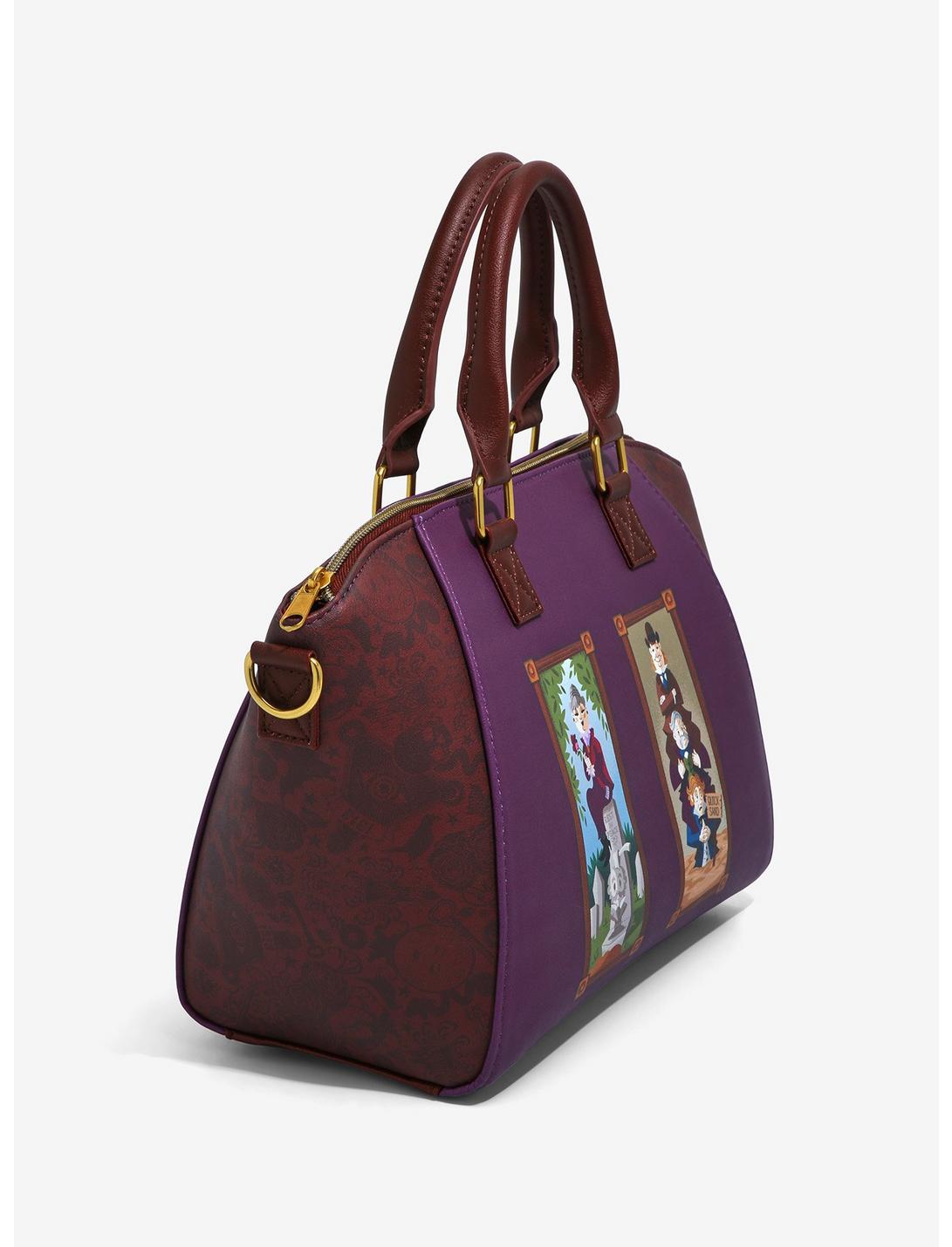 ... Is the room actually stretching, or is it just our imagination? Whatever it is, better pack up all of your essentials into this bag and check out of this haunted mansion! Add a frightfully fun touch to your outfit with this satchel bag, featuring the iconic stretching portraits from The Haunted Mansion on both sides. Icons from the attraction like Madame Leota are printed all over on the sides. Comes with an interior drop pocket, an adjustable, removable crossbody strap and top zipper closure.