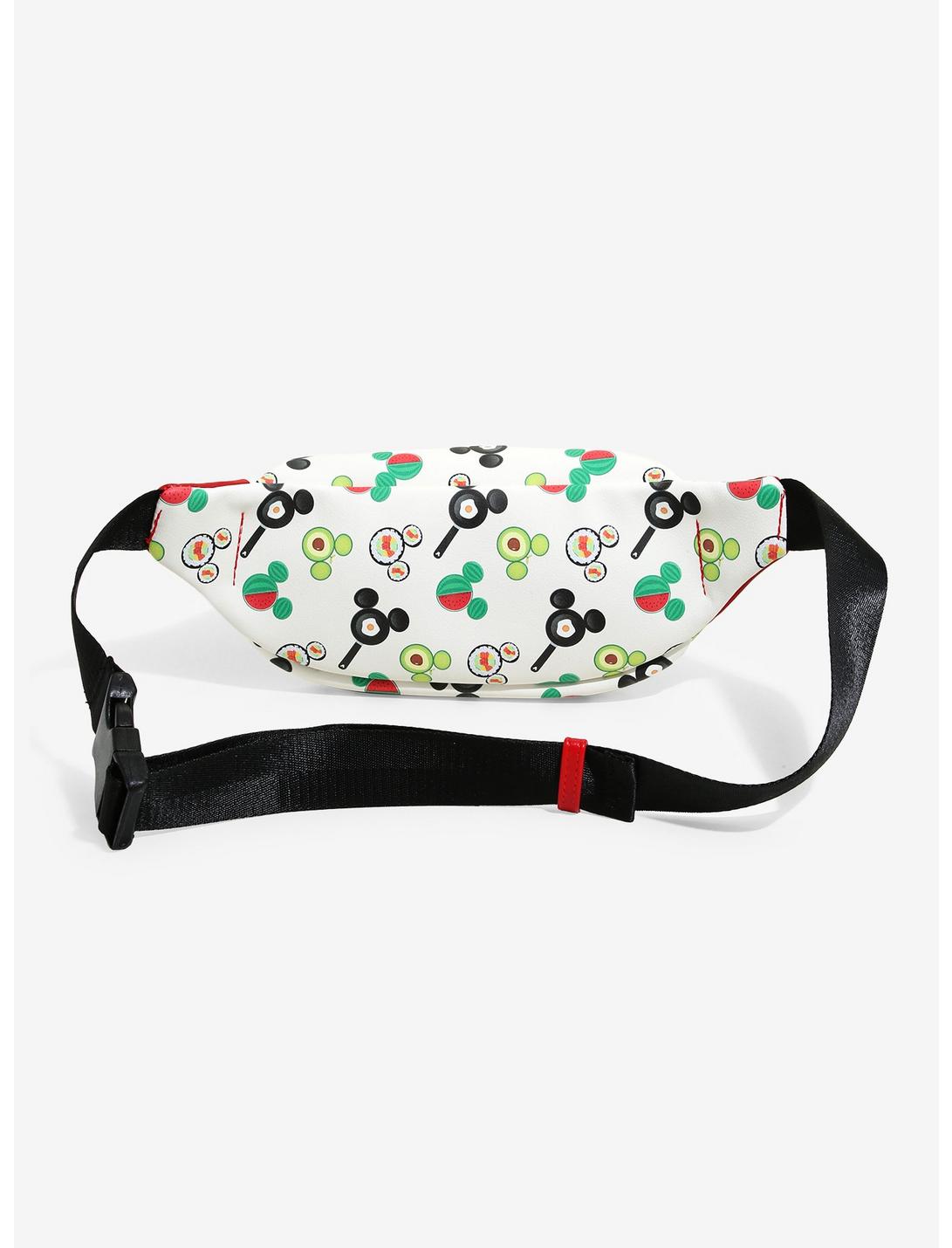 Oh, boy! What a feast! This Loungefly fanny pack and card holder set is sure to satisfy any Disney fan's appetite. The fanny pack features an allover print of food-centric Mickey heads, silver tone hardware, a Mickey charm, and an adjustable waist strap with a buckleclip closure.