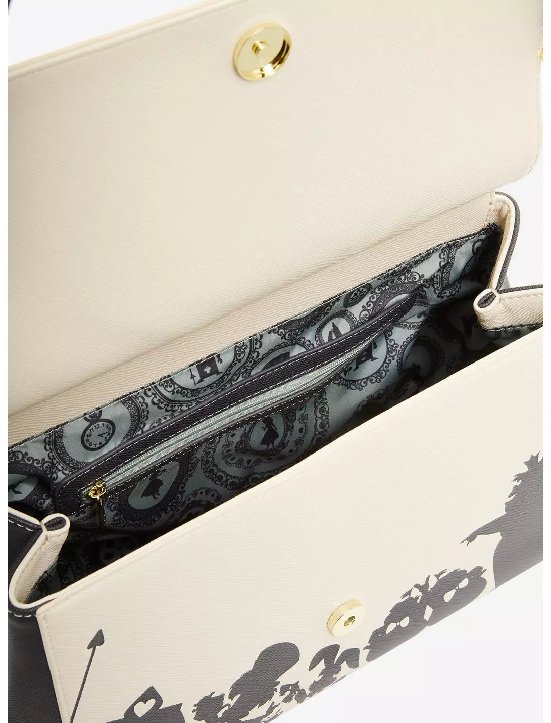 Get ready for a very important date with this Alice in Wonderland-inspired handbag! Featuring a die-cut silhouette portrait of Alice, the White Rabbit, and the Cheshire Cat, the front flap also includes applique flowers. With silhouette portraits of other characters on the body, this bag includes a top handle and a removable crossbody strap, perfect for preparing for your next adventure in Wonderland.