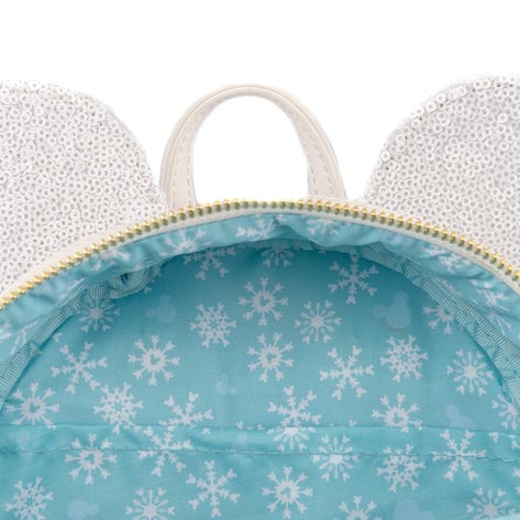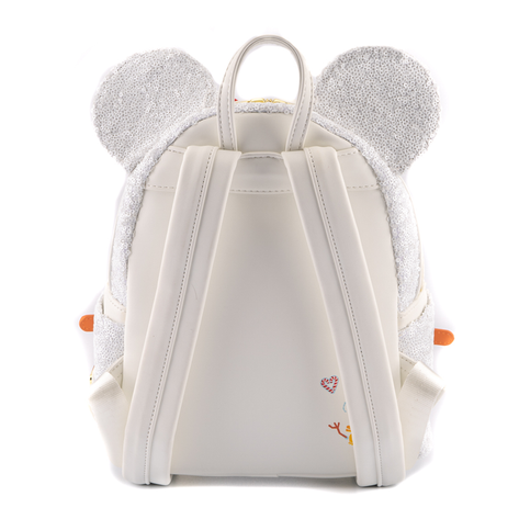 Act fast to collect this Loungefly exclusive. The Disney Snowman Minnie Mouse Cosplay Mini Backpack is made of vegan leather (polyurethane). Bag has adjustable shoulder straps, sturdy metal hardware, and features: applique, sequins, and printed details.