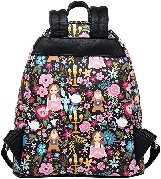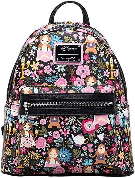 Loungefly Disney Beauty and the Beast Belle Floral Mini Backpack! This all-over floral design has flowers of all kinds and features Belle, Lumiere, Cogsworth, Mrs. Potts, and Chip! This bag features printed details along with an enamel zipper pull of Belle reading a book.