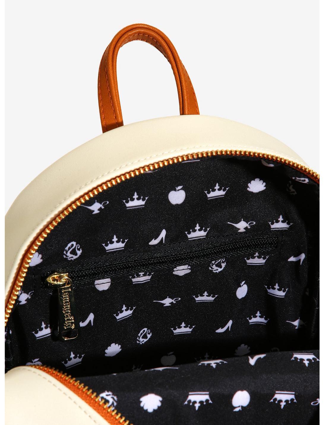 Have you ever seen anything so wonderful in your entire life? This faux leather Loungefly mini backpack features a metal crown plaque, brand badge, main zip compartment, debossed details, two side pockets, gold tone hardware, adjustable straps, black interior lining with an allover icon print, an interior zip pocket, and a die-cut front pocket showcasing Ariel, Jasmine, Snow White, Mulan, and Cinderella in chibi form.