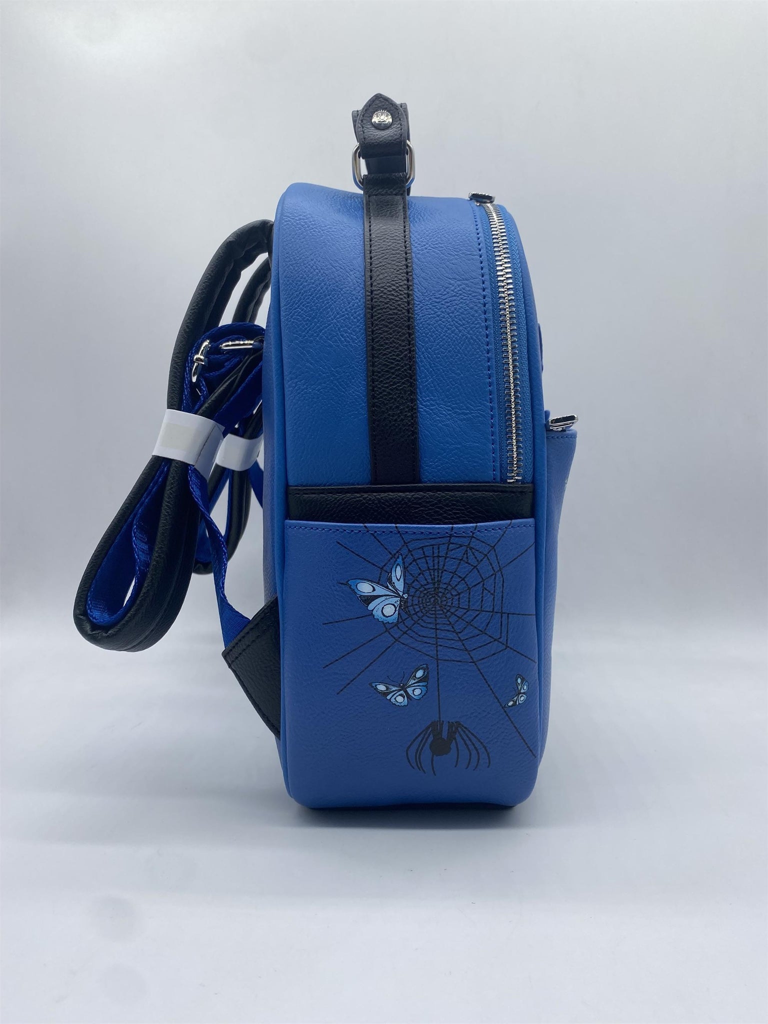 It is hard not to fall in love with our dark blue Loungefly mini backpack exclusive with glow in the dark butterfly features and side pockets. The front zipper pocket featuring our couple Emily and Victor.