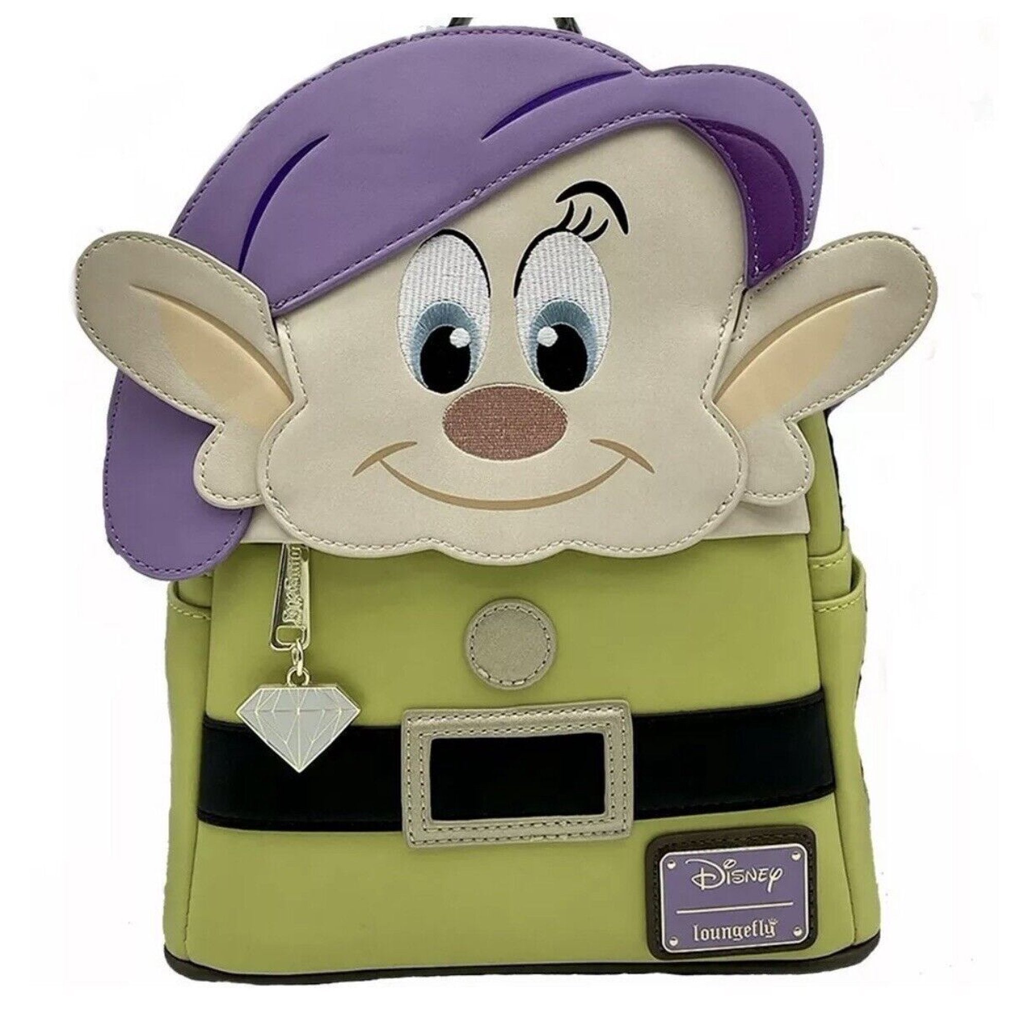 This adorable Loungefly Dopey Cosplay Mini Backpack is made with faux leather and features embroidered eyes & nose and a zipper charm in the shape of a diamond. Hidden behind Dopey's chin is a front zip pocket. There are pockets on both sides as well as one inside pocket. The lining features all 7 dwarves and on the back is a detail image of Snow White and Dopey.