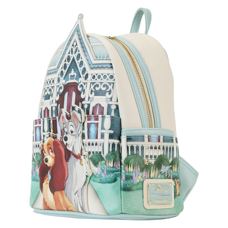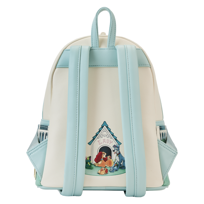 The very picture of happiness! Our exclusive Loungefly Disney Lady and the Tramp Portrait House Mini Backpack is a must-have accessory for those wishing to fall in love all over again with this classic film. On the front, Lady and Tramp stand before a charming Victorian house, brought to life in applique detail. Original art fills every scene. On the side pockets, you’ll find delightful pups playing in the garden or discovering the newspaper left on the front lawn. On the back, the entire family gathers at Lady’s doghouse for a heartwarming moment.