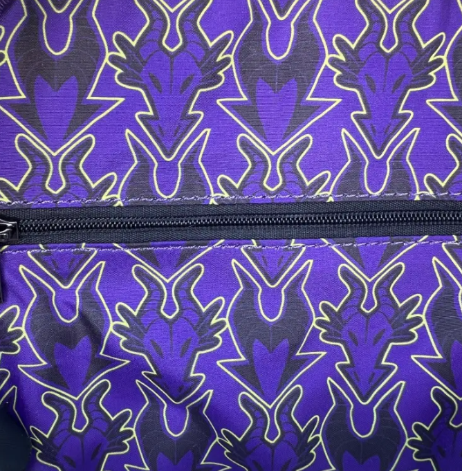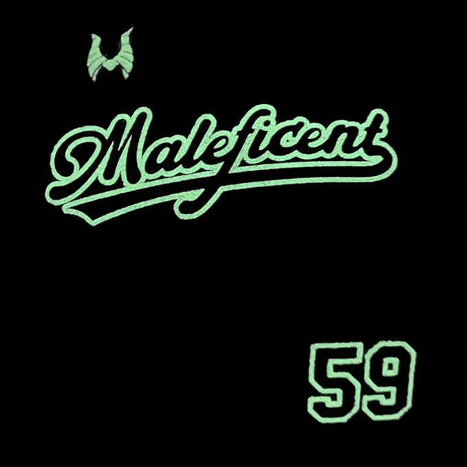 Introducing the exclusive Loungefly Disney Villains Maleficent Jersey Glow Mini Backpack, featuring Maleficent from Disney's Sleeping Beauty. The jersey style design pays homage to Sleeping Beauty releasing in 1959, with embroidered and sequin details. Made of faux leather with enamel Disney X Loungefly logo plate, athletic mesh, embroidered, sequin, glow in the dark, and applique details, along with themed interior lining.