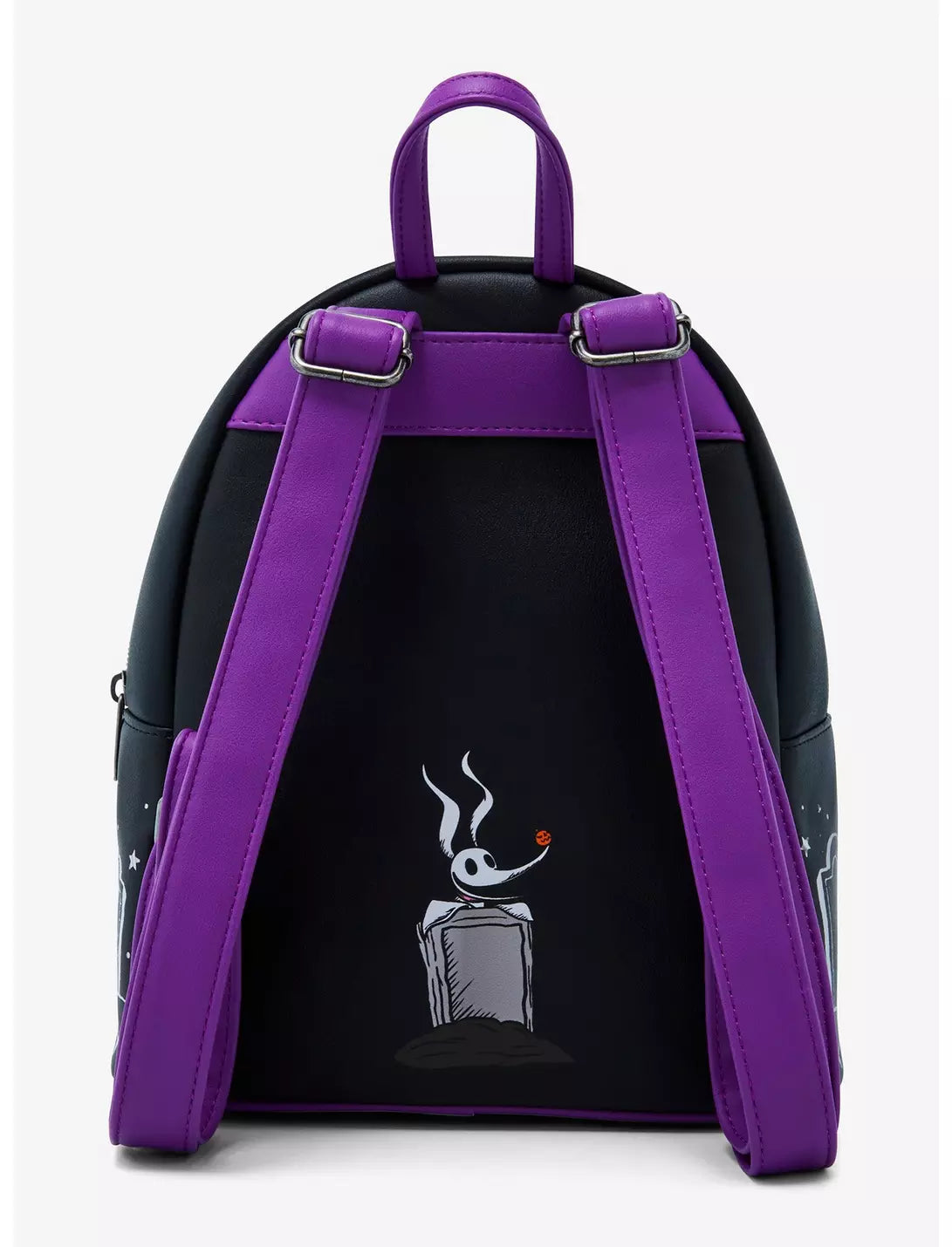 Let Zero light up your Loungefly mini backpack collection! Your favorite ghost pup from The Nightmare Before Christmas is featured in a doodle design on the front zipper pocket, with a full moon and a forest full of creepy flowers, trees and bats in the background. Comes with a front zipper pocket and interior drop pocket.