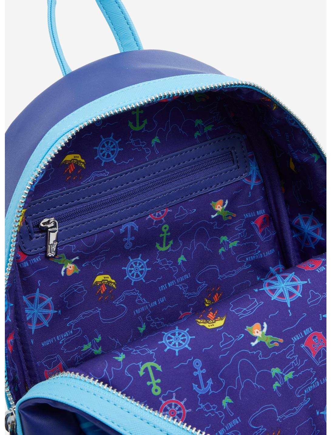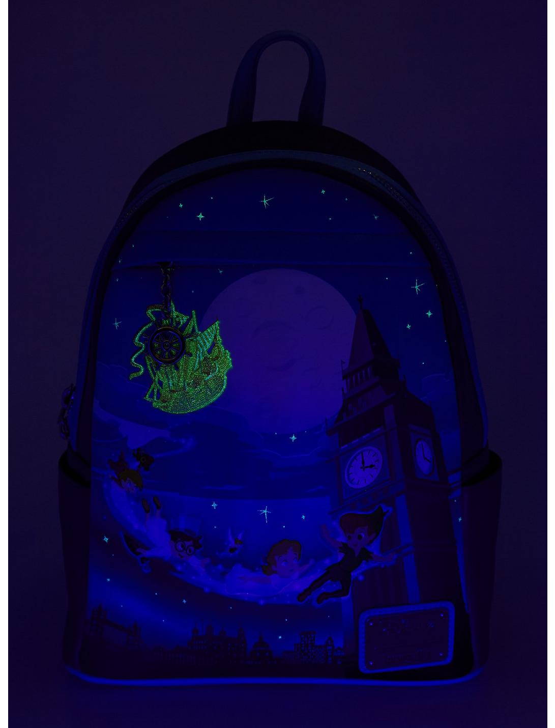 - Join Peter Pan and the Darling children on their way to Neverland with this Loungefly mini backpack! This bag features a debossed portrait of Peter Pan, Tinker Bell, and the Darling children flying over London with a glow-in-the dark pirate ship and stars in the background. This bag also has a front zipper pocket with a ship steering wheel charm, two side pockets, adjustable straps, and an image of Peter Pan and Tinker Bell on the back, making this the perfect bag to take with you on your adventures with the Lost Boys.Polyurethane; polyester lining