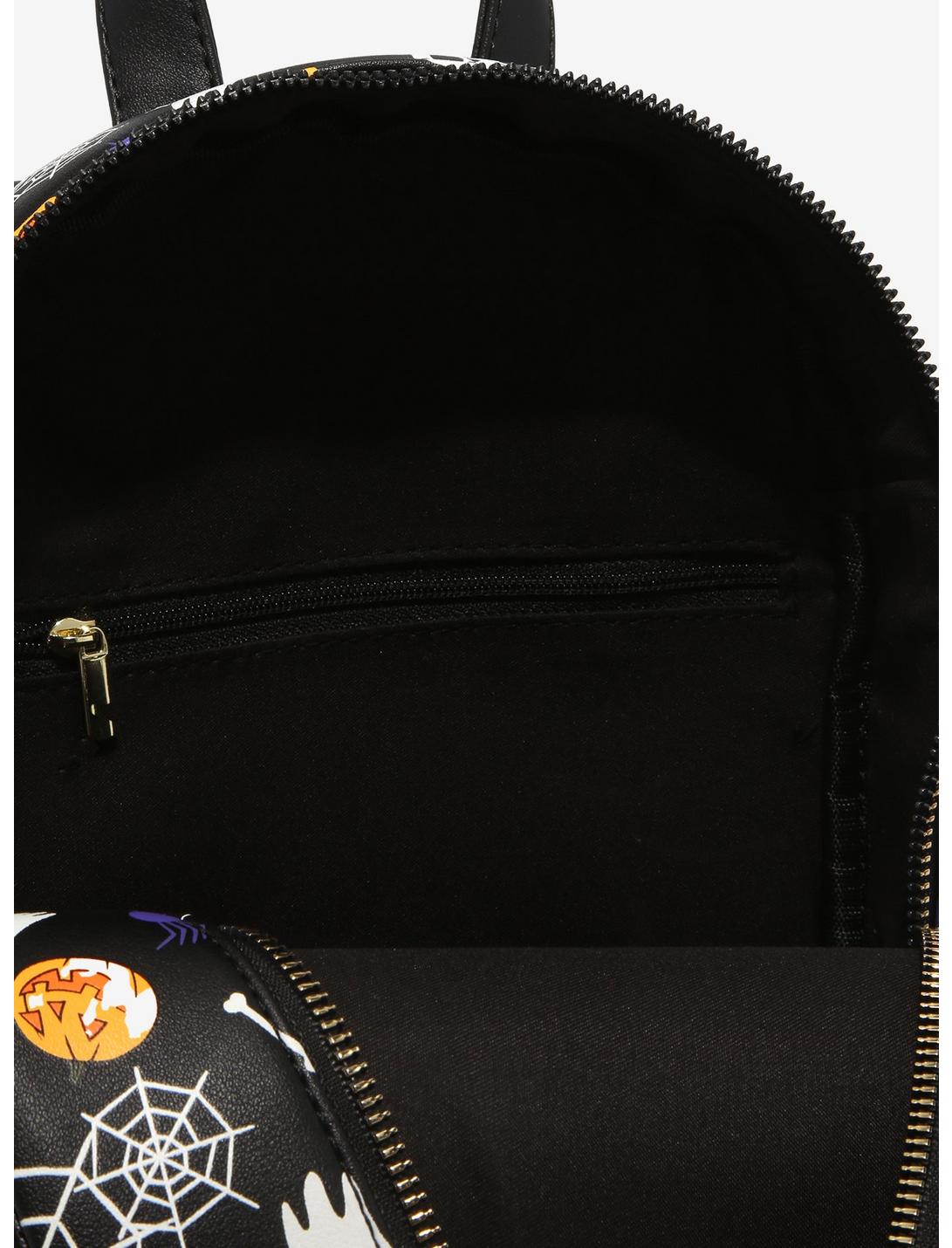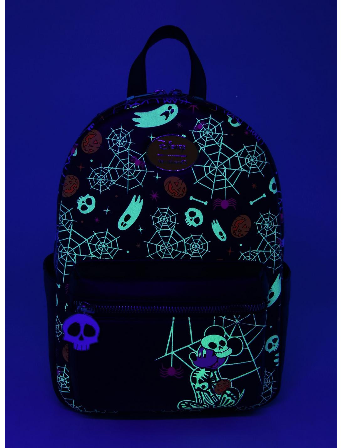 - Need something to carry all of your Halloween treats? Mickey Mouse has you covered! Add some magic to your Halloween outfit with this mini backpack, featuring Mickey Mouse dressed in a bone-chilling skeleton costume on the front zipper pocket, with an allover print of Mickey Mouse-shaped cobwebs, ghosts, skeletons and more all around. Comes with a skull enamel zipper pull on the front pocket, side pockets and interior zipper pocket. To add more spooktacular fun, this backpack also glows in the dark!8" x 4" x 11"