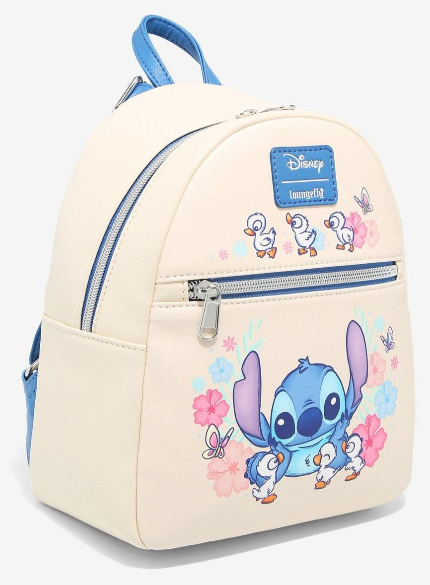 Stitch would never leave any of these ducklings behind! From Lilo & Stitch, this cream and blue mini backpack features an image of Stitch lovingly looking over some ducklings. Adjustable straps, front zipper, interior drop pocket and silver tone hardware.