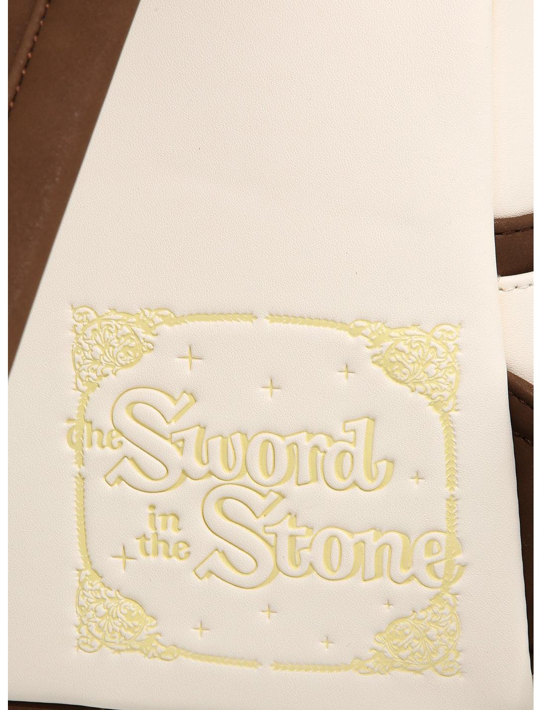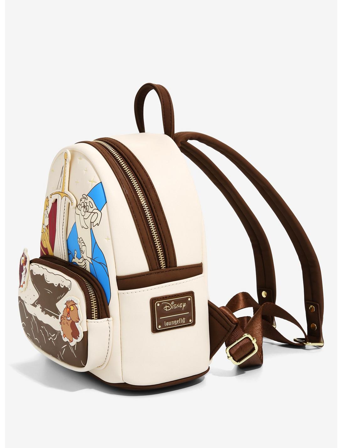 Carry around all of your needs for the New Year's Day tournament with this Loungefly mini backpack! Arthur and Merlin stand next to a die cut detail of the sword on the front of this bag, completing the Sword in the Stone look with a front pocket designed to look like the anvil it's impaled in. Also featuring gold-toned hardware, a die cut detail of Archimedes, an enamel brand badge, and an interior pattern lining, you won't need the strength of King Arthur to carry this stylish bag around!