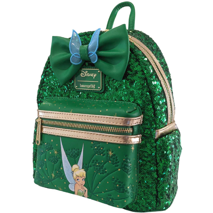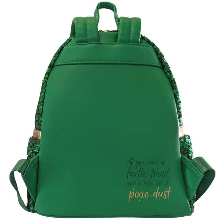 All you need is faith, trust and this adorable Loungefly Disney Tinkerbell Green Sequin Mini Backpack, featuring printed and debossed details, shiny gold hardware, a front zip pocket, 2 side pockets, bow with wings, and sequins galore!