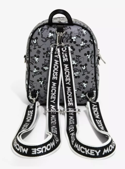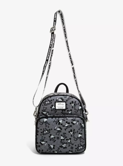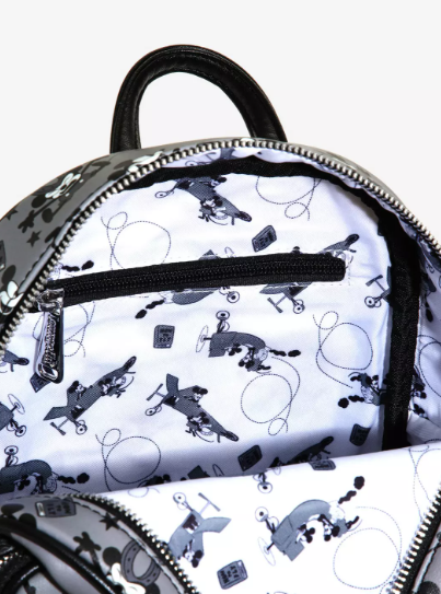Celebrate the mouse who started it all with this timeless faux leather mini backpack by Loungefly! The black and white exterior print features an allover design of vintage Mickey from the 1928 short, "Plane Crazy". Additional details include a brand badge, front zip pocket, main zip compartment, interior zip pocket, interior lining with an allover Mickey plane pattern, silver tone hardware, and adjustable seat belt straps with a "Mickey Mouse" text design. Transform your mini backpack into a crossbody!