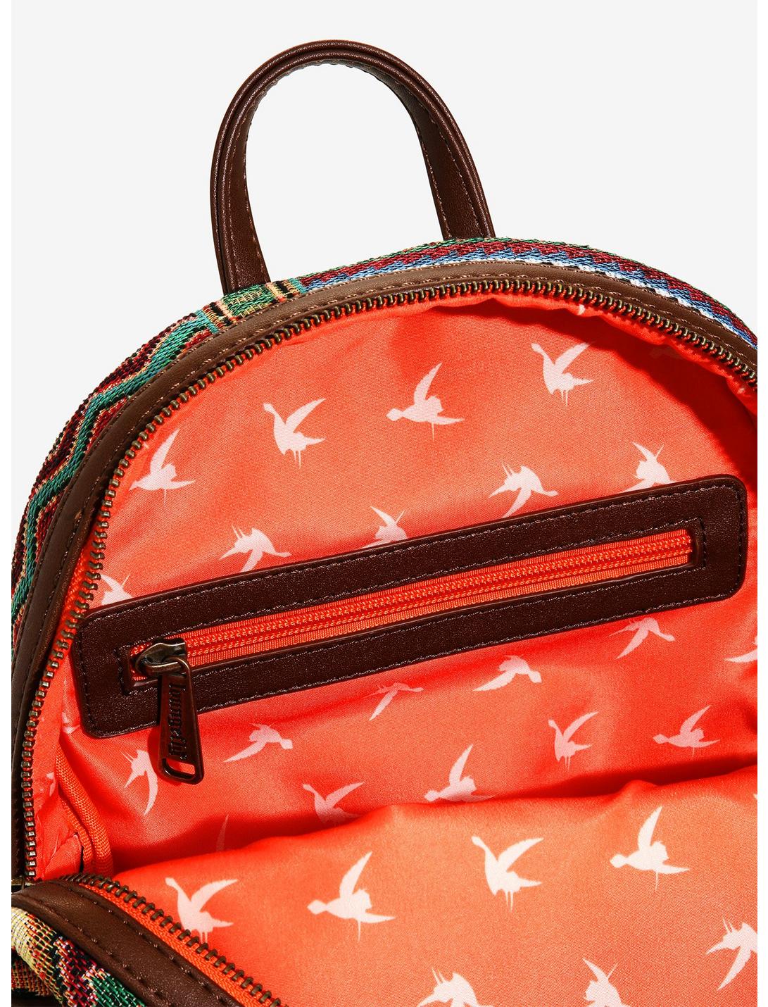 The patterned woven design on the backpack showcases embroidered Pocahontas details on the front and side. Features a front zip pocket, main zip compartment, interior zip pocket, orange interior lining with an allover Flit silhouette print, two side pockets, bronze tone hardware, and adjustable faux leather straps.