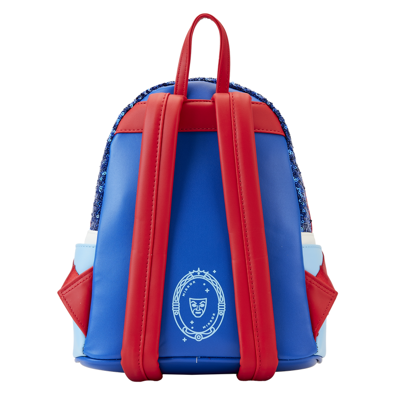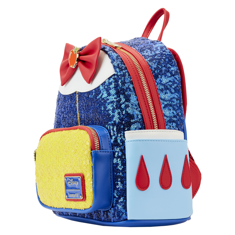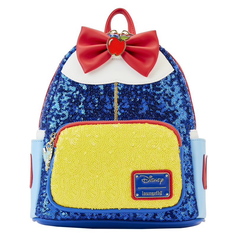 On the backpack, an enamel bluebird charm accompanies the bag’s yellow zipper pocket while royal blue sequins appear above. An enamel apple charm cinches a red bow that appears along Snow White’s collar. Turn the bag around to see sleeve details appear on the bag’s side pockets, along with the Magic Mirror on the bag’s back!