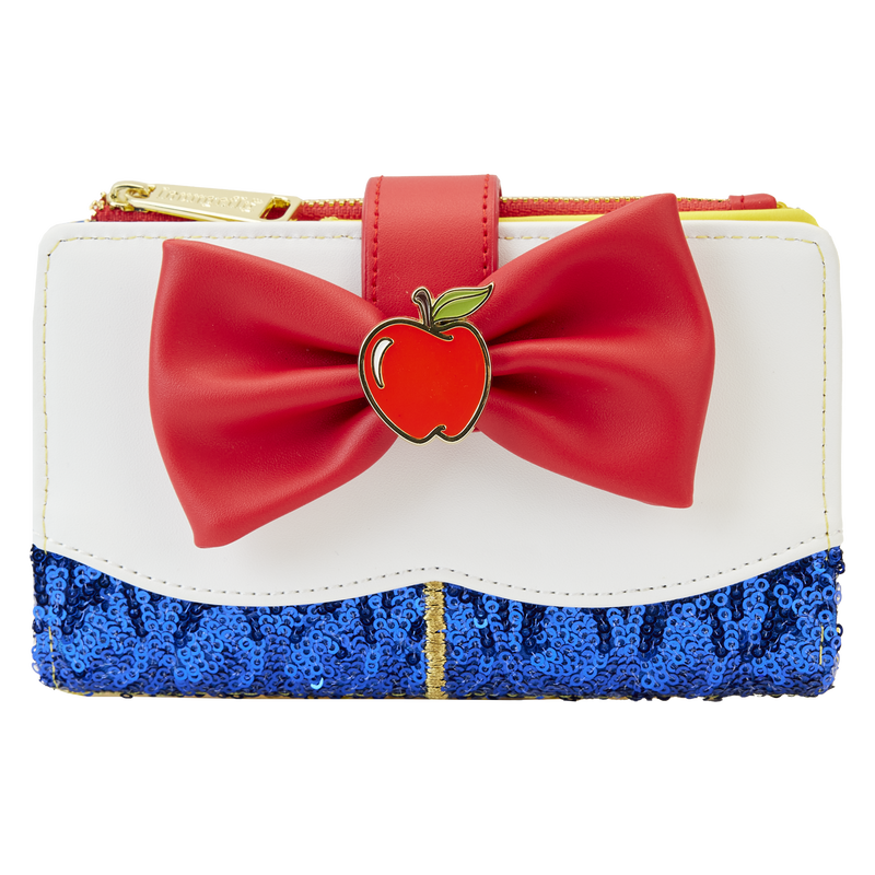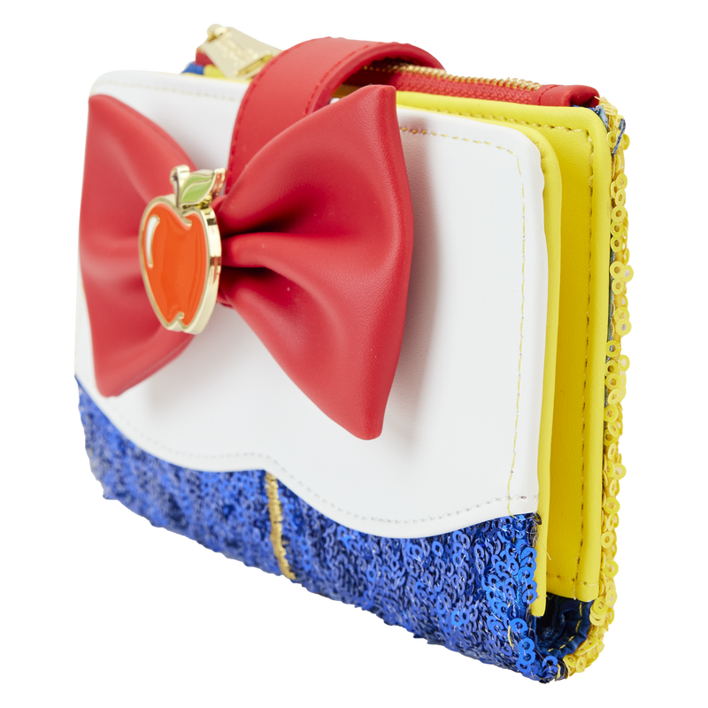 On the wallet, an enamel apple charm cinches a red bow that appears along Snow White’s collar. Royal blue sequins appear below, and yellow sequins appear on the wallet’s back. With seven slots for holding cards and a clear slot to hold your ID.
