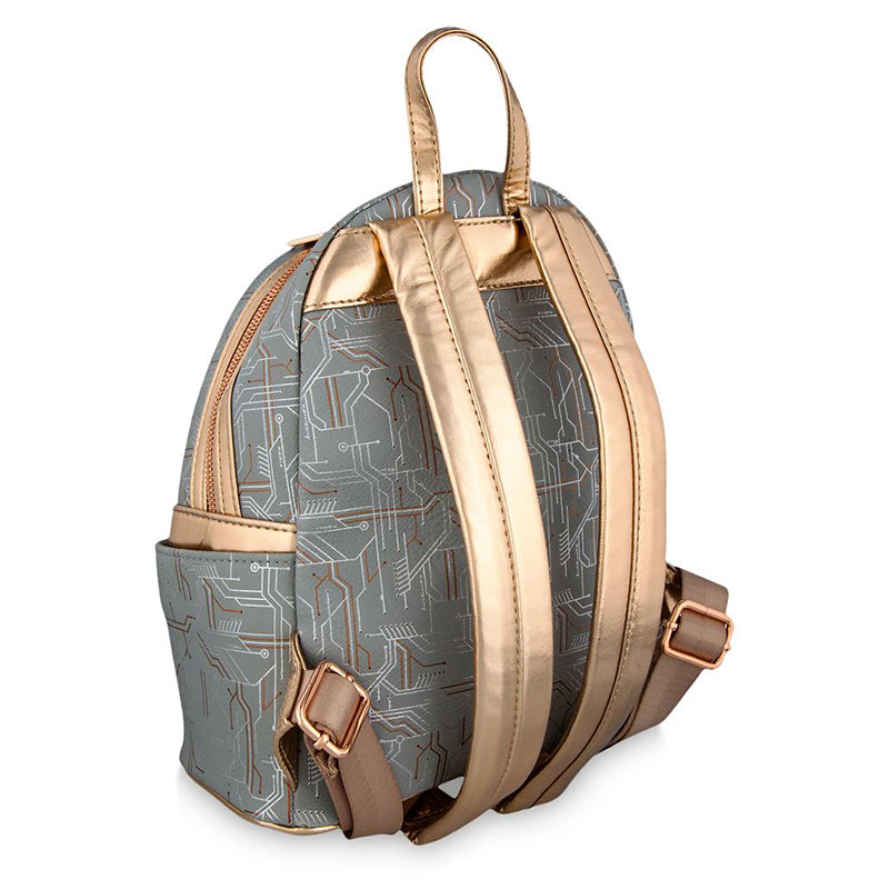 Black spire outpost droid circuit Faux leather design Gray with silver and rose gold circuit accents Front pocket with zip closure Zippered closure 2 exterior side pockets