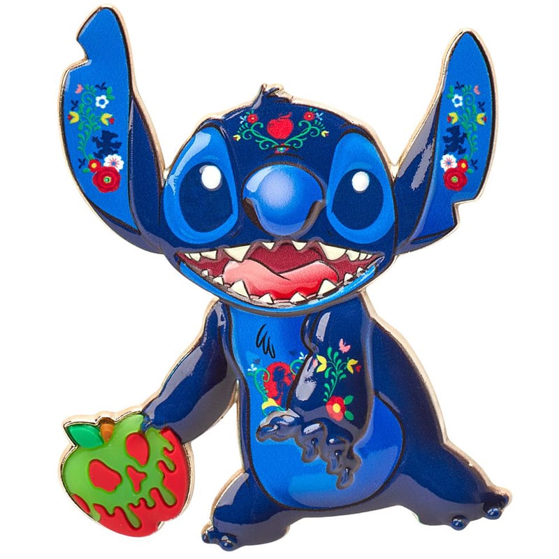 Inspired by the original Lilo & Stitch film trailers from 2002 featuring Stitch crashing classic Disney film scenes, this monthly, limited release series of collectible pins puts a new spin on the adored extraterrestrial. Each release honors a different, beloved Disney film. This month's entry, inspired by Snow White and the Seven Dwarfs, features a glow-in-the-dark poisoned apple.