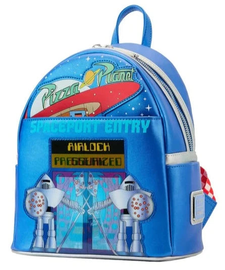 The Loungefly Toy Story Pizza Planet Space Entry Mini Backpack is made of vegan leather (polyurethane). Bag has adjustable shoulder straps and sturdy metal hardware. Additional features include applique, lenticular, glow-in-the-dark, and printed details. Take note of the coordinating inside lining.
