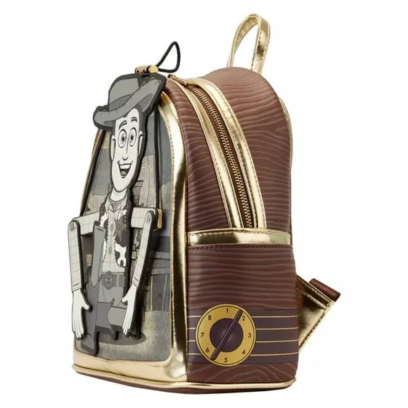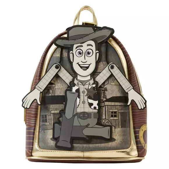 Toy Story Woody’s Roundup Puppet Mini Backpack is bringing your favorite afternoon television special to life. On the front, a vintage television takes shape while showing a black-and-white western setting. Woody appears on the front zipper pocket as a marionette puppet, complete with hinged details attached to strings that allow him to move. Pull the three-dimensional handle at the top of the bag to set things in motion! On the back, the Woody’s Roundup logo appears next to a channel dial. The exclusive Loungefly Toy Story Woody’s Roundup Puppet Mini Backpack is made of vegan leather (polyurethane). Bag has adjustable shoulder straps and sturdy metal hardware. Additional features include movable applique, embroidered, metallic, embossed, debossed, and printed details, along with coordinating interior lining.