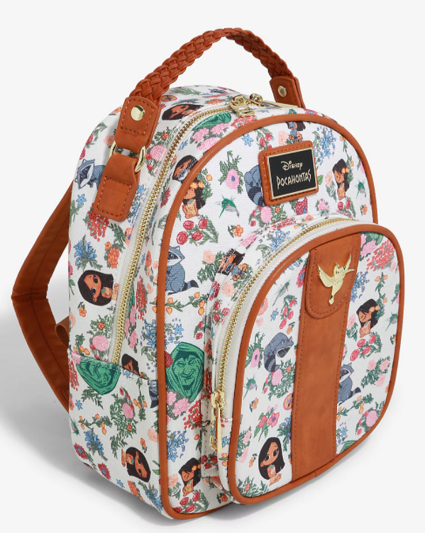 Listen with your heart—it's telling you to add this gorgeous mini backpack by Her Universe to your collection! Inspired by Disney's Pocahontas, the organic cotton exterior features an allover floral print of the proud heroine and her friends in chibi form. Also features a metal badge, gold tone Flit badge, main zip compartment, front zip compartment, woven handle, contrasting faux leather brown piping, and adjustable straps.