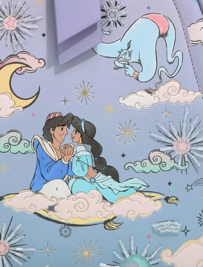 Whether you're a street rat or royalty, you can carry all your belongings in a classic Disney style with this Aladdin mini backpack from Our Universe! Inspired by the beloved animated movie, this bag features a colorful canvas depicting a magical scene in the sky with beaded features. With a front debossed graphic of Aladdin sharing a loving embrace with Jasmine atop their magic carpet, as Genie flies high in the background. Features gold-toned hardware, an enamel brand badge, two side pockets, a front pocket with a snap-button closure, adjustable shoulder straps, and a night sky interior lining pattern.