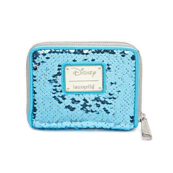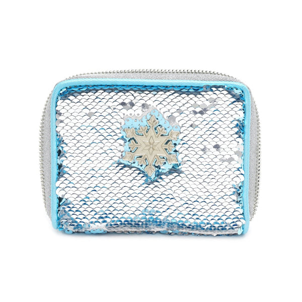 This zip around wallet includes reversible sequins in Arendelle aqua and silver. It also displays a 3D molded metal rivet.