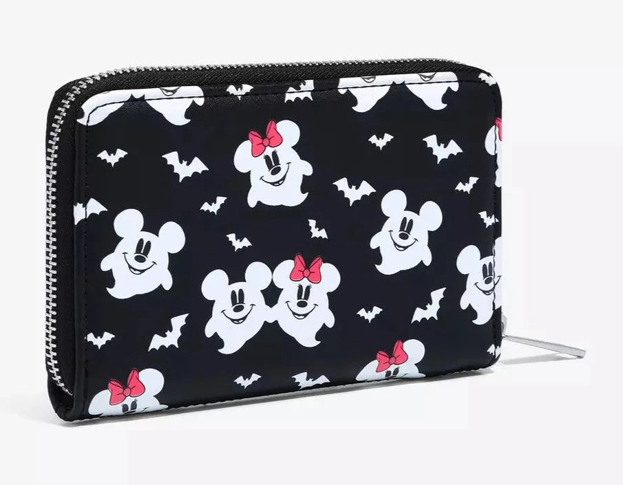 Ring in the spooky season with your favorite mouse pair, Mickey and Minnie! Featured as two adorable ghosts, the iconic Disney mascots appear on this small zip wallet's allover print for one spookily sweet design. With a matching glow-in-the-dark finish to bring their ghoulish glow to life, the pair are ready to help you accessorize for your big Halloween outing! Also features an enamel Loungefly brand badge, silver-toned hardware, three card pockets, a bills compartment, and a clear ID sleeve.