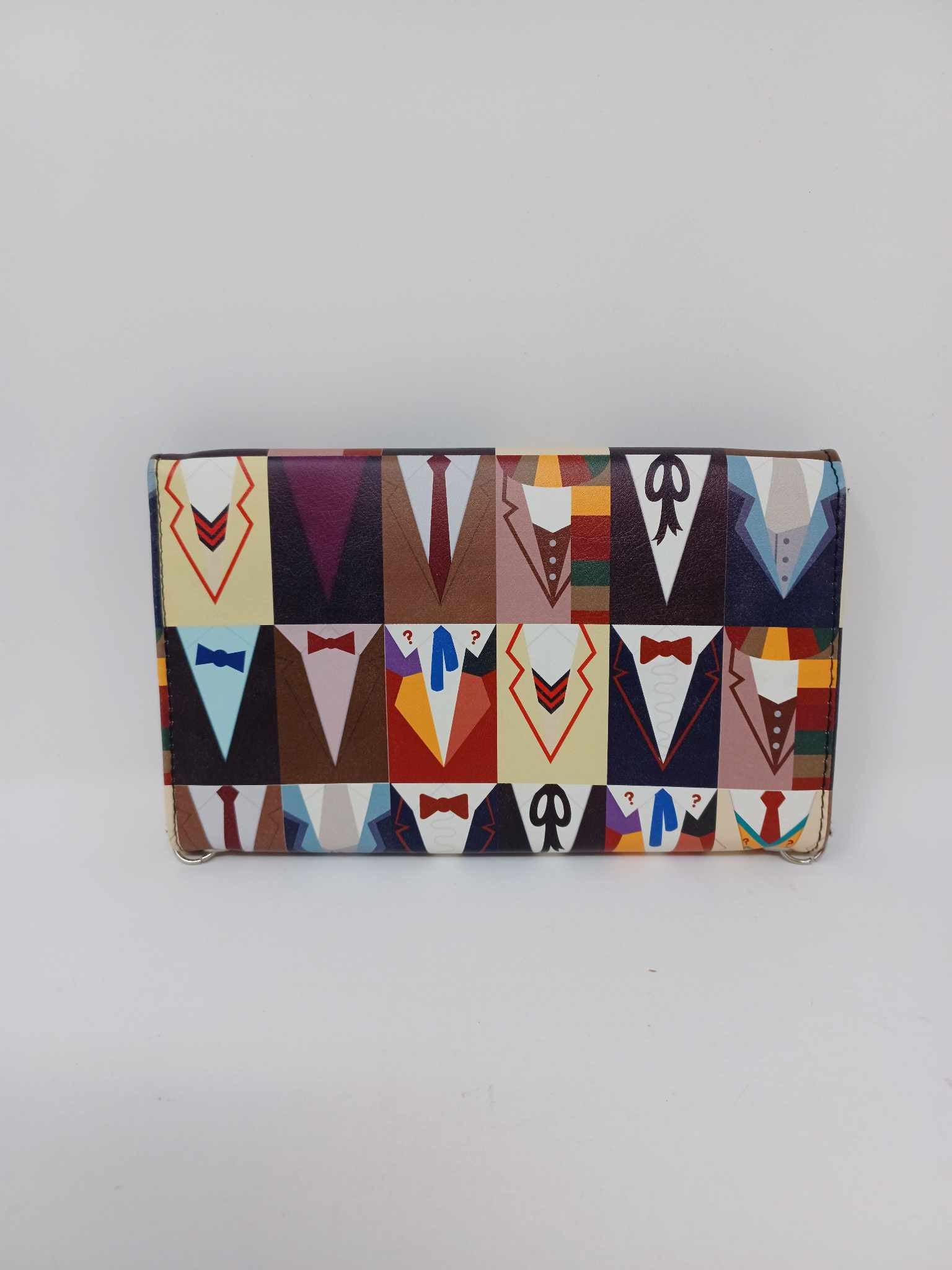 Carry everything you need with you with this classy crossbody wallet. Featuring an all-over print of the many different Doctor's suits and outfits. This bag uses a metal snap closure, to reveal a wallet style interior with many small pockets for cards. It uses a 48" metal chain strap to hold this bag over your shoulder with ease.