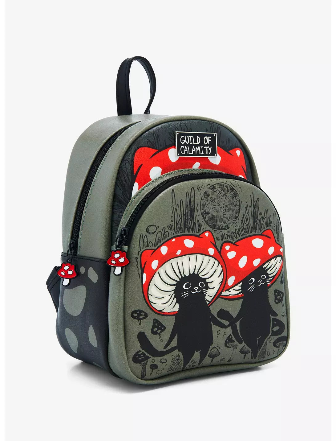 Make some shroom for the cutest mini backpack to hold your essentials! This Guild of Calamity bag has two mushroom cats on the front zipper pocket and cat-shaped mushroom zipper charms. Comes with interior drop pocket and adjustable straps.