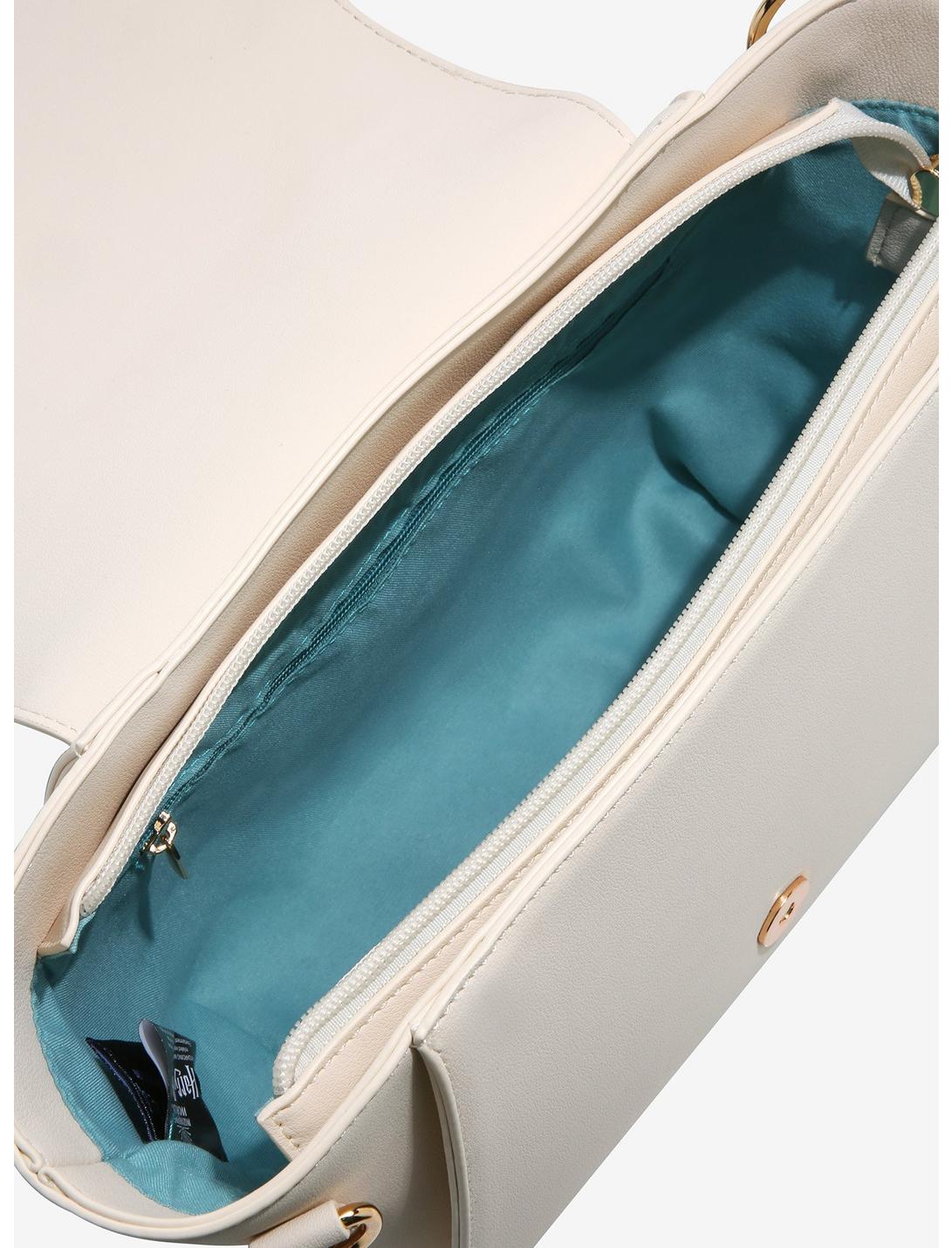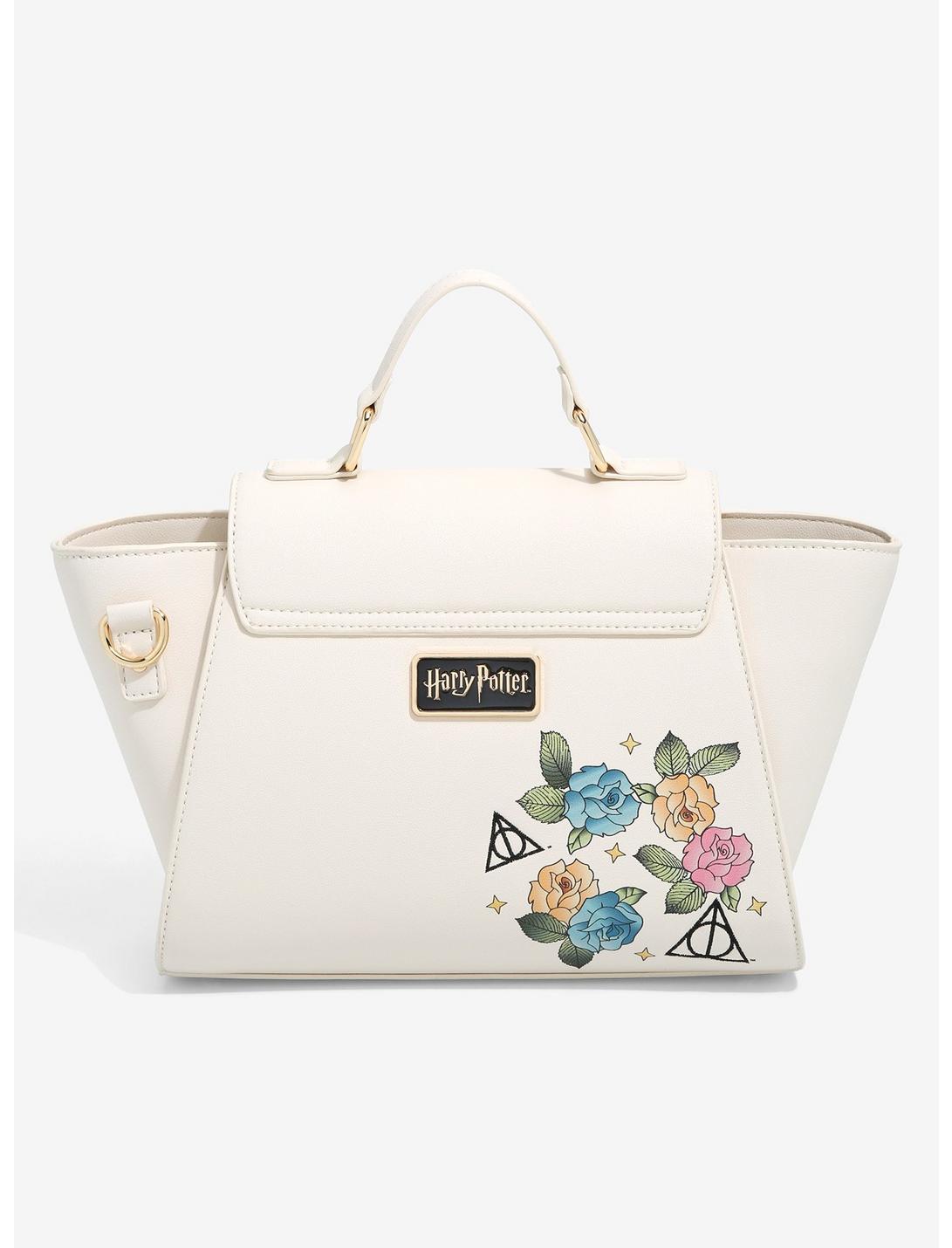 Accessorize with a bit of Wizarding World charm with this Harry Potter handbag! Decorated with colorful floral appliqués and printed details, the Deathly Hallows logo receives an airbrushed-like makeover, adorning the front of this bag to represent the Elder Wand, the Resurrection Stone, the Cloak of Invisibility, and the characteristics that drove their creation. Also features an enamel brand badge on the back, gold-toned hardware, and a removable adjustable shoulder strap.