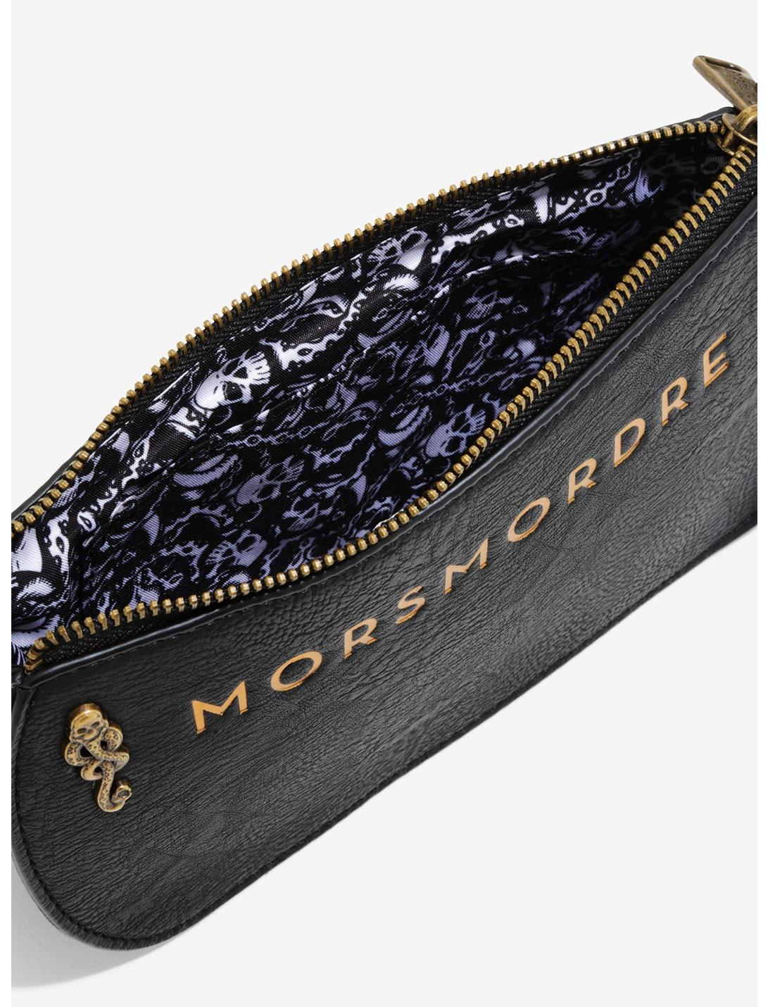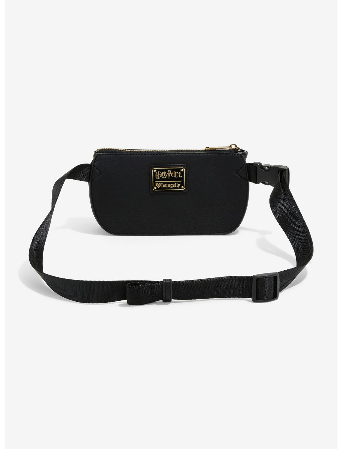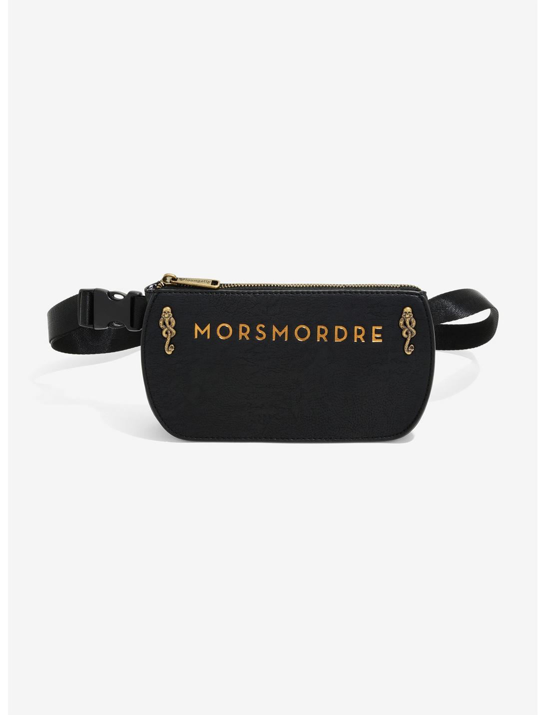 Send the Dark Mark into the air in style. This black fanny pack isn't just high fashion, it's also dedicated to the Dark Lord. It's got the incantation to conjure the Dark Mark in gold foil embossment on the front, flanked by two metal Dark Mark plaques. With a brand plaque on the back, printed lining, and an interior drop pocket it's perfect for whatever trouble you may find yourself getting into.