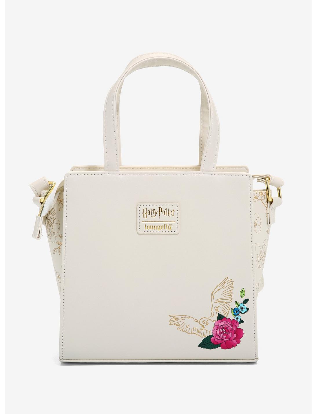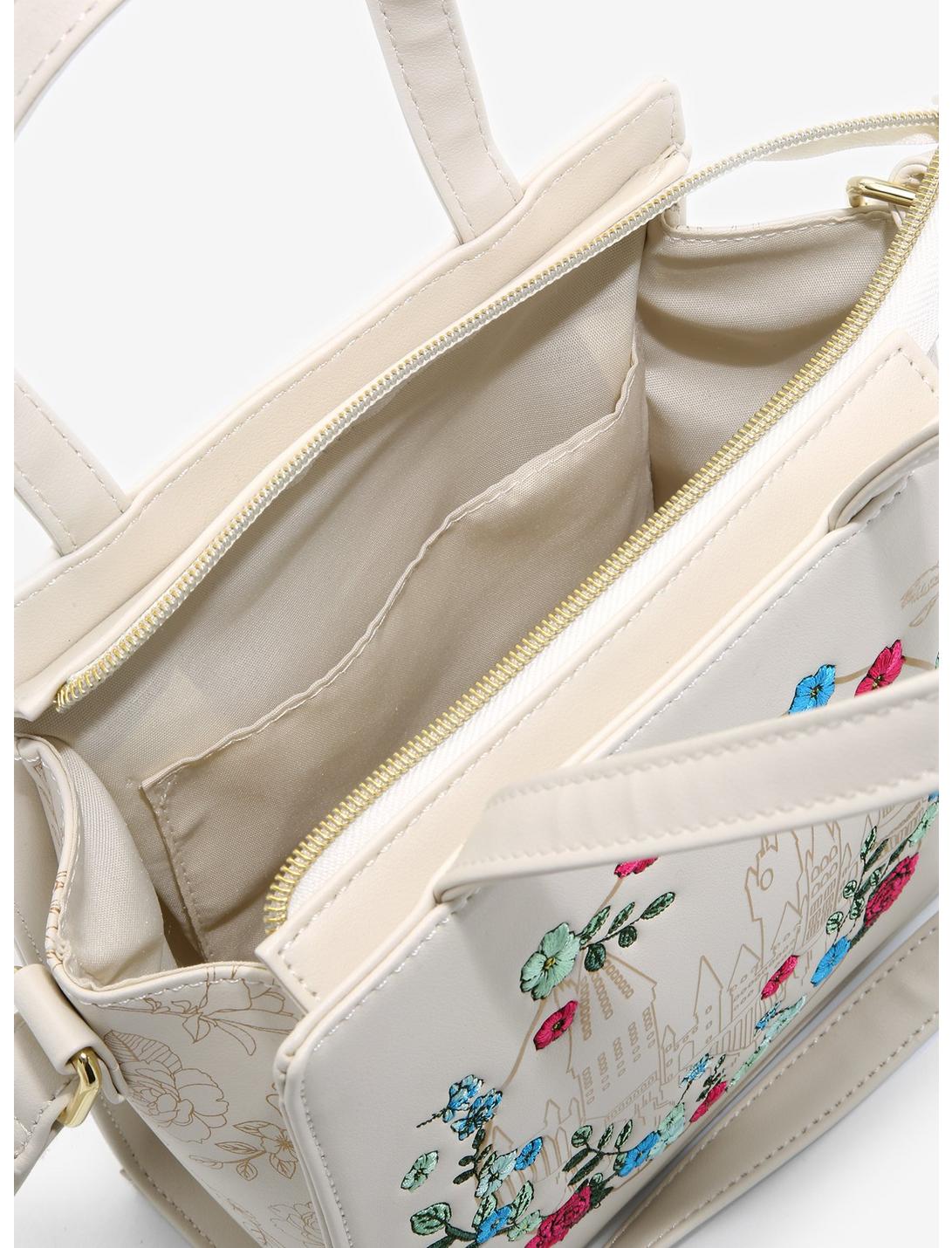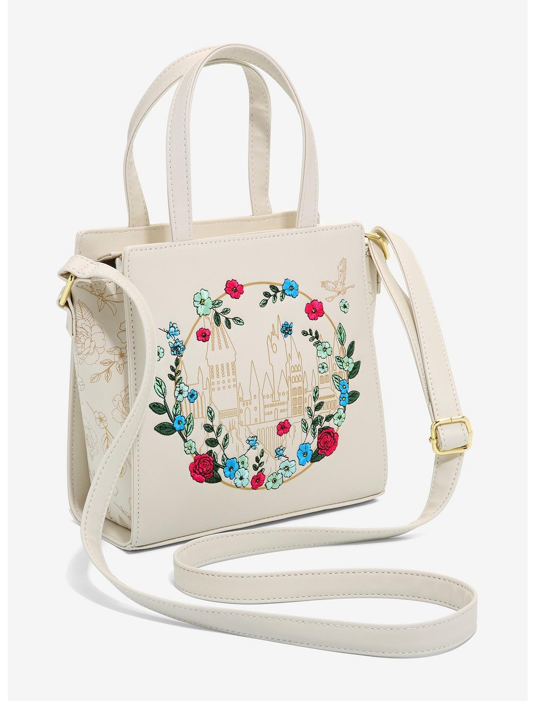 Feel cute on your next trip to Hogsmeade! This cream tone satchel bag features a metallic gold outline of Hogwarts surrounded by embroidered flowers. The sides have metallic gold floral outlines. Adjustable crossbody strap, top zipper closure and interior drop pocket.