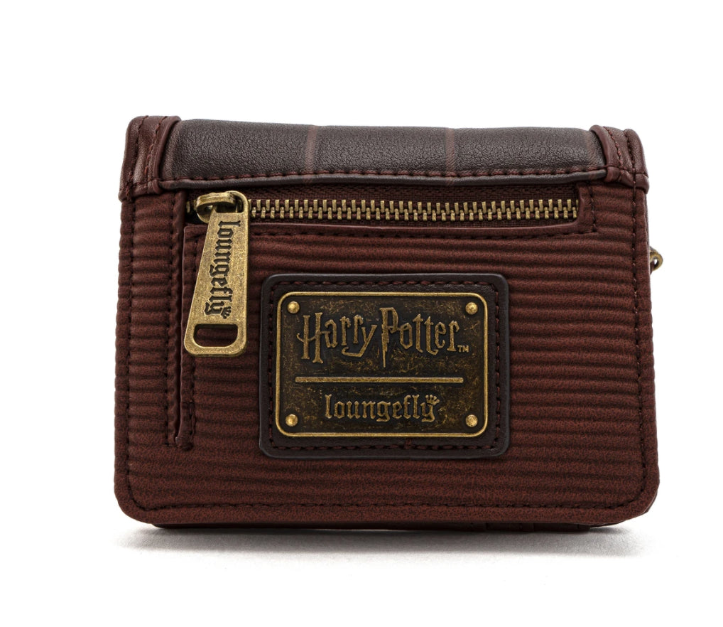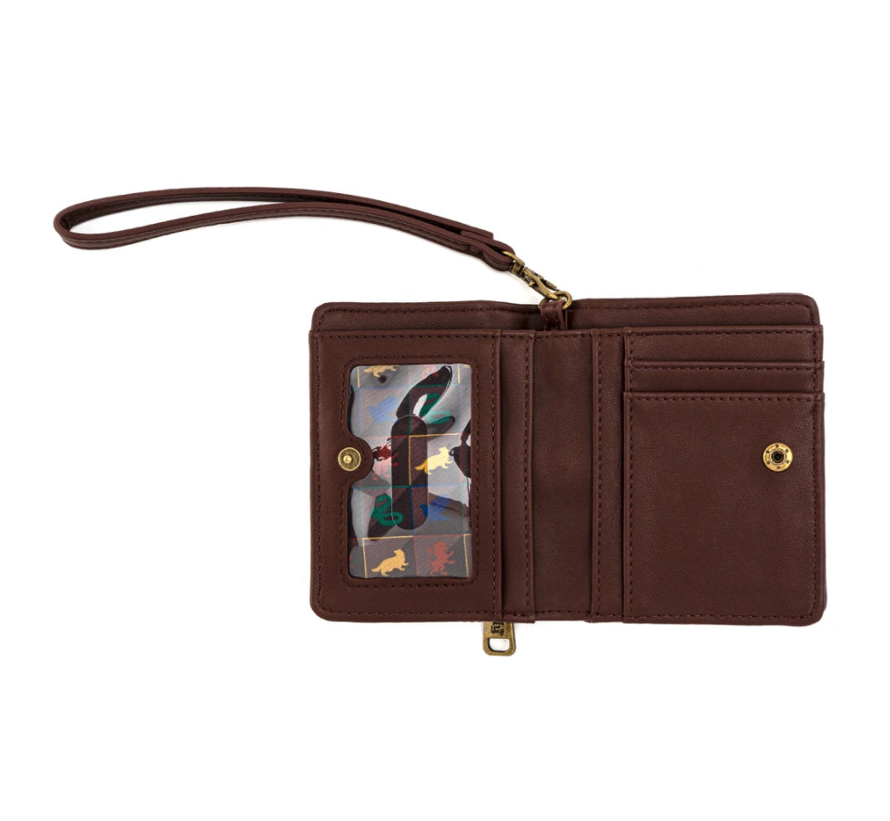 This faux leather wristlet has it all. Just look at all of the details on this wallet. It includes applique, printed, removable strap and metal plaque details. This magical wallet also has a beautiful faux corduroy treatment. The interior lining is a repeat pattern of all of the house mascots.