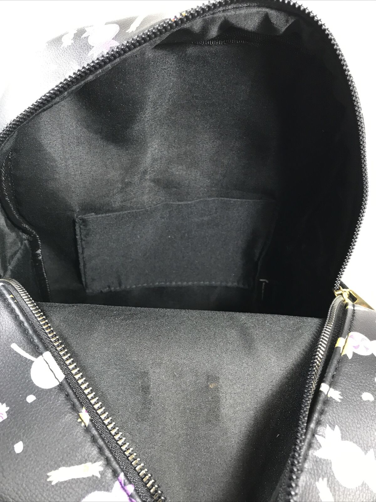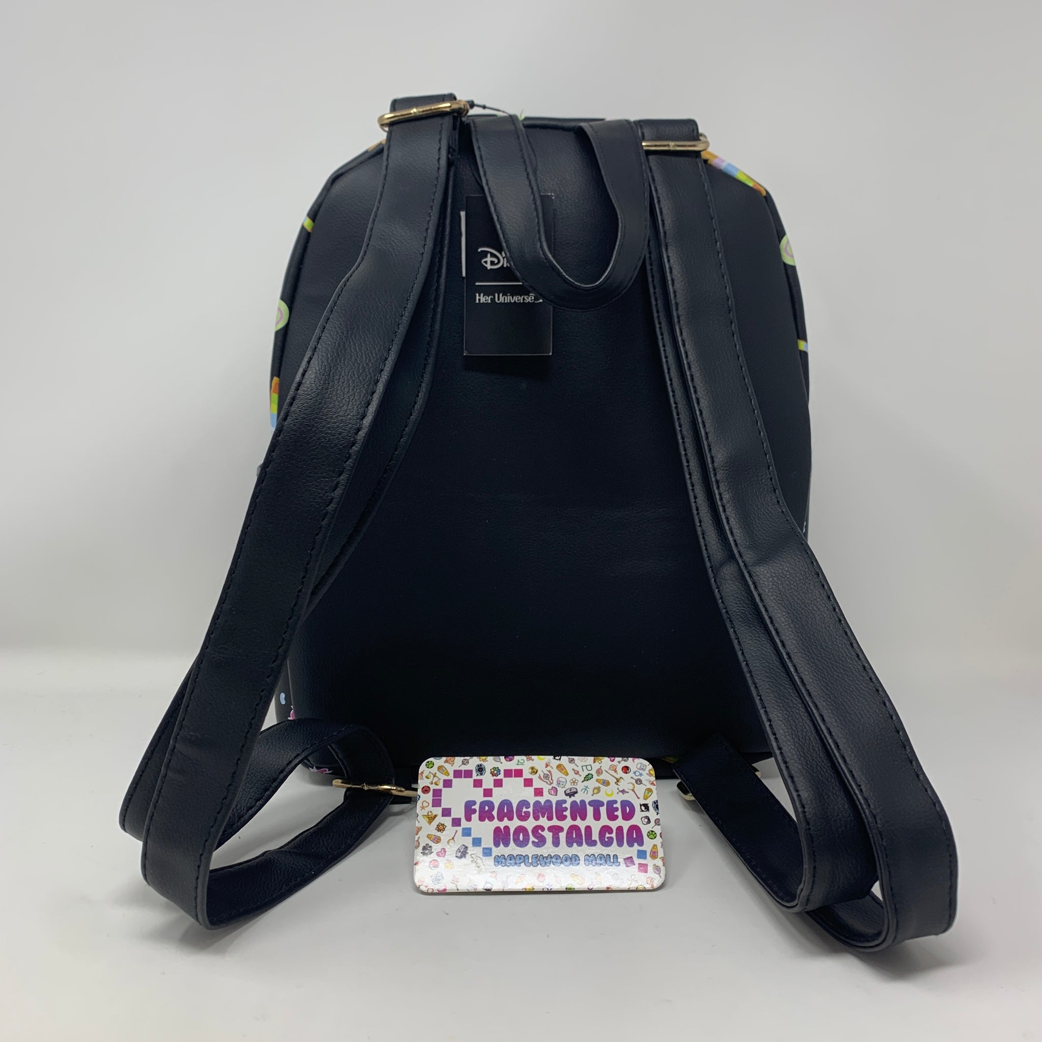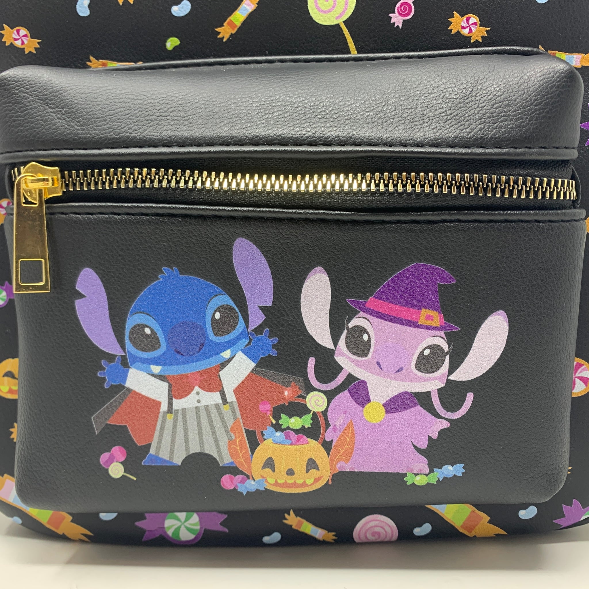 - They definitely look like they're here for treats, but we wouldn't put it past mischievous Stitch to pull a trick! This frightfully fun backpack is perfect to get you into the Halloween spirit, with an allover print of jack-o-lanterns and candy plus a print of Stitch dressed as a vampire and Angel dressed as a witch on the front pocket. Adjustable straps, side pockets, front zipper pocket, and interior drop pocket.9" x 4" x 11"