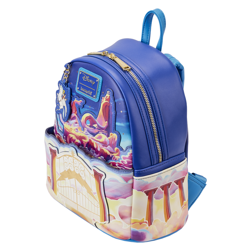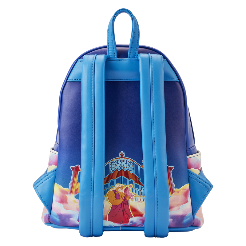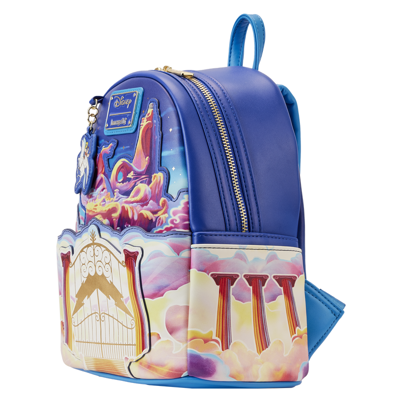 Introducing the Hercules Mount Olympus Golden Gates mini backpack from Loungefly! This vegan leather bag features a die-cut drop pocket on the front behind the clouds, a vegan leather zipper charm of Hercules and Pegasus, adjustable straps, side pockets, and applique, gold-foil, and printed details.